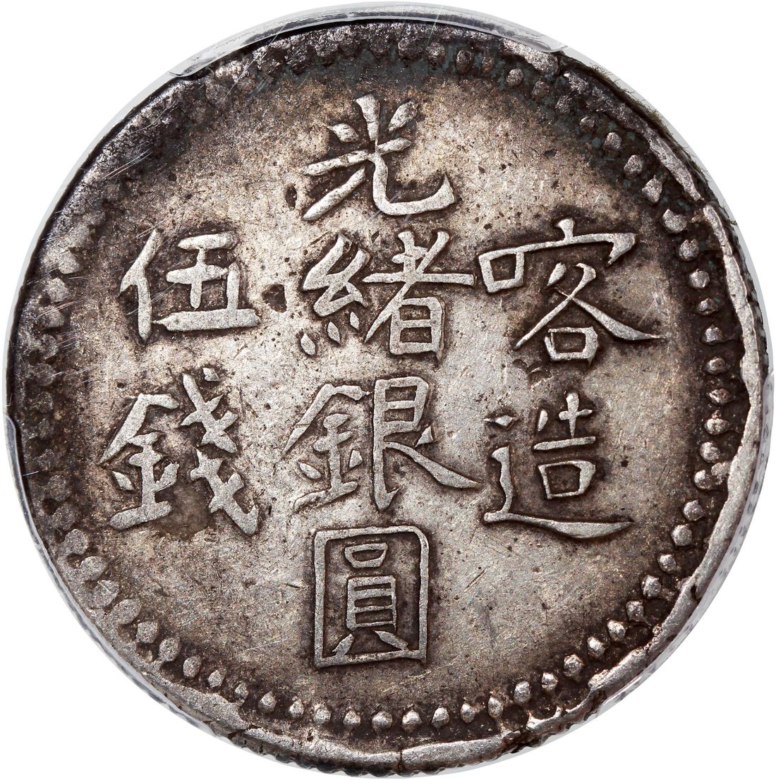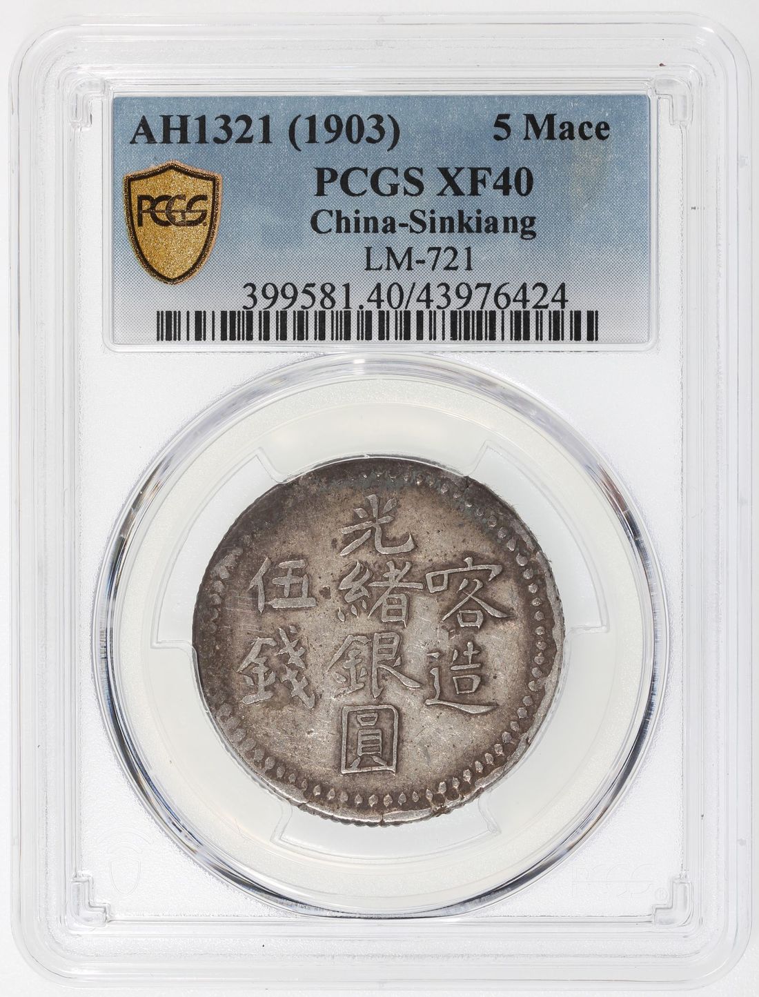China, Qing Dynasty, Sinkiang Province, [PCGS XF 40] silver 5 mace, AH1321(1903), Guangxu Yin Yuan, Kashgar mint, (LM-721), evenly toned. Cert.# 43976424
