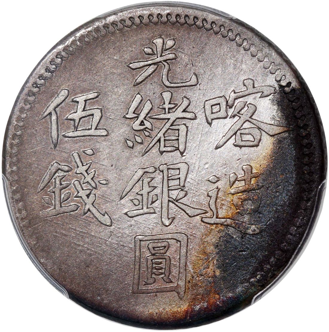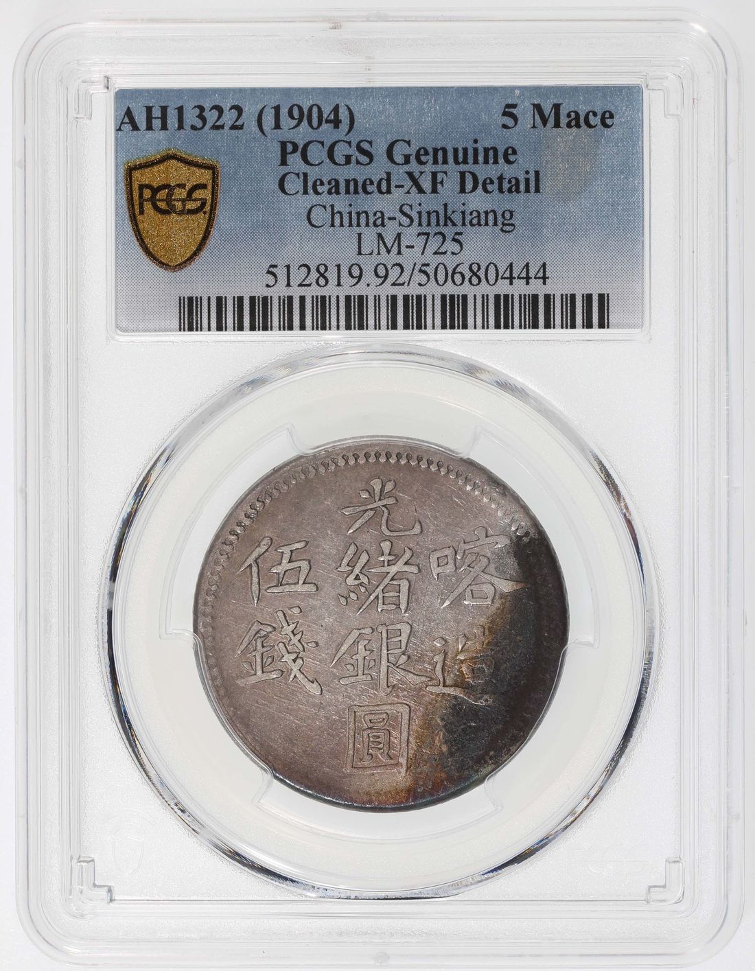China, Qing Dynasty, Sinkiang Province, [PCGS XF Detail] silver 5 mace, AH1322(1904), Guangxu Yin Yuan, Kashgar mint, (LM-725), cleaned. Cert.# 50680444