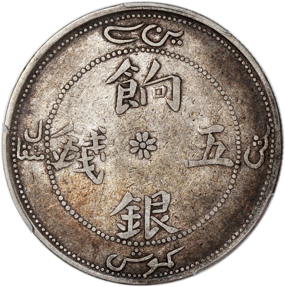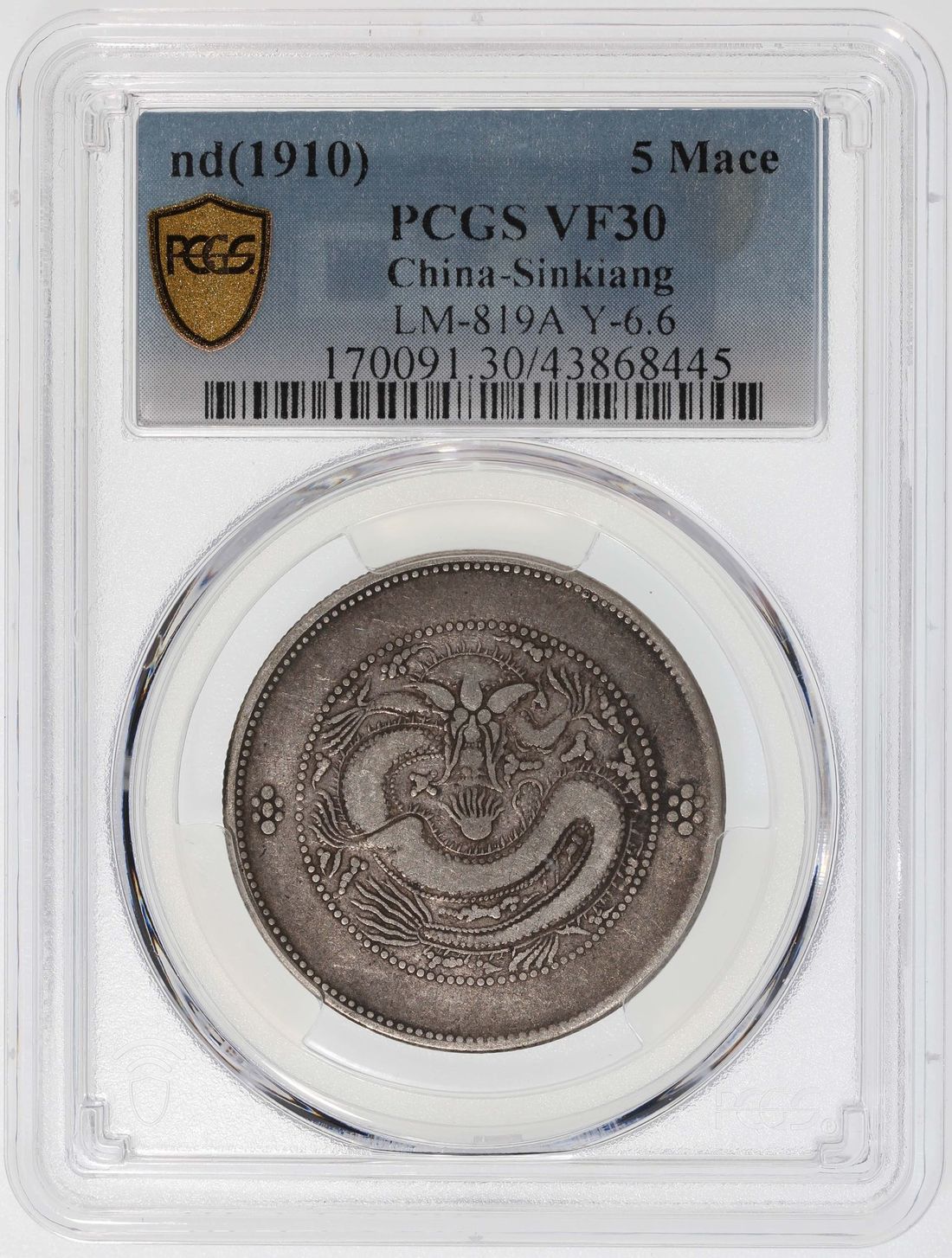 China, Qing Dynasty, Sinkiang Province, [PCGS VF30] ration silver 5 mace, ND (1910), 'Xiang Yin Wu Qian', variety with 'Chahtai' on characters side on reverse and circled dragon on obverse, (LM-819A, KM-Y-6.6), Cert. #43868445, fairly even steel grey toning