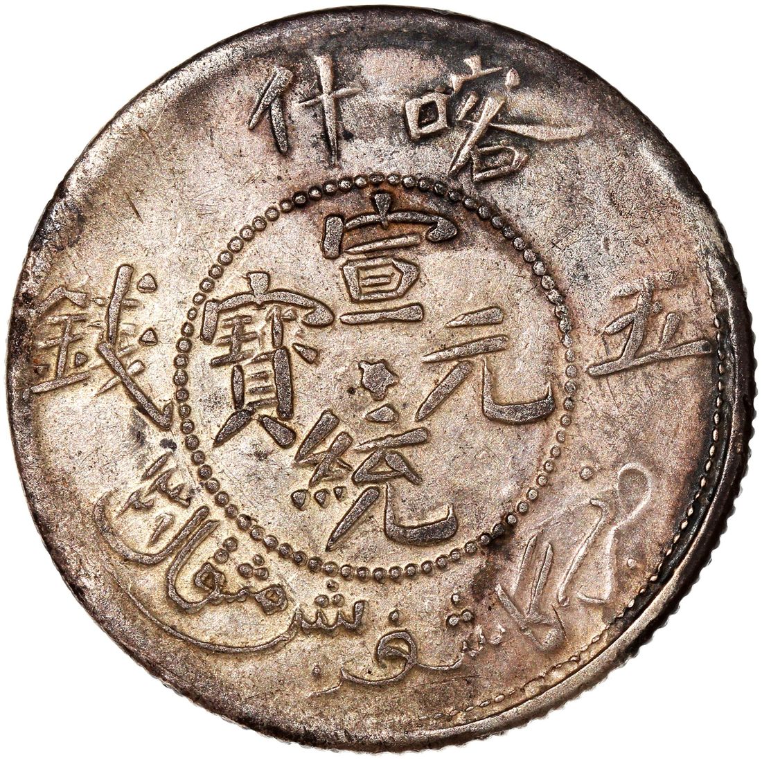 China, Qing Dynasty, Sinkiang Province, silver 5 mace, AH1329, Xuantong Yuan Bao, Kashgar, VF-XF condition with toning, viewing is recommended, sold as is