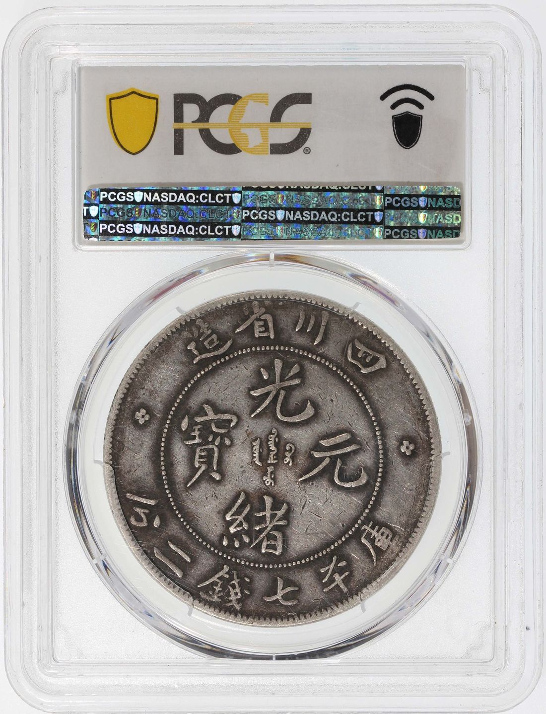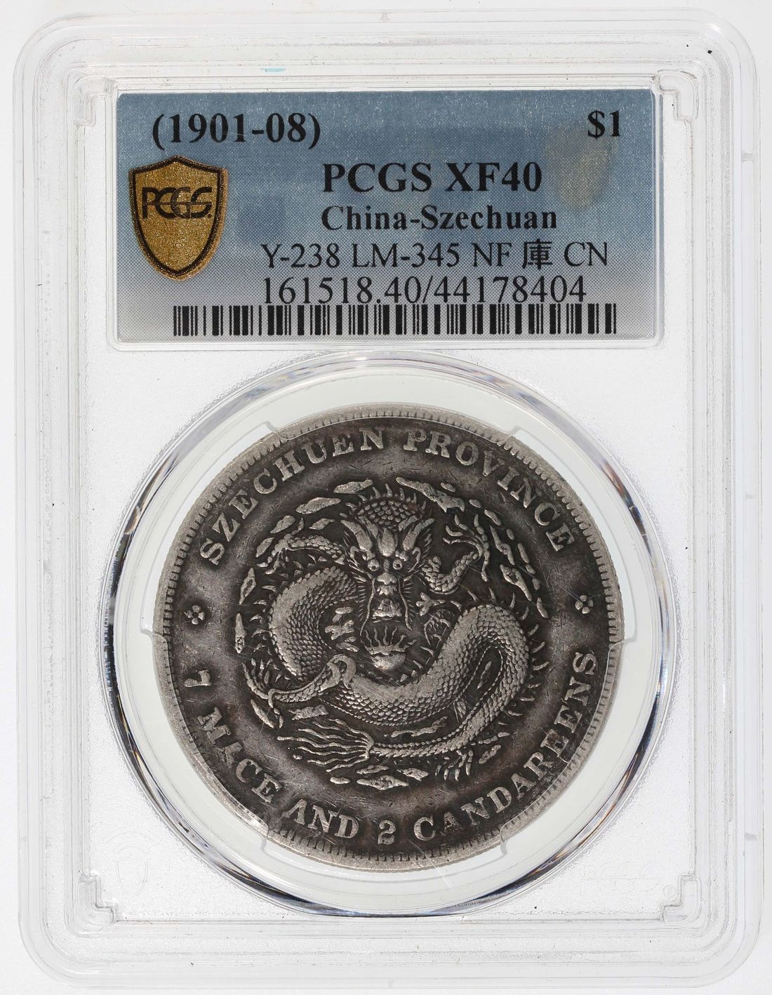 China, Qing Dynasty, Szechuan Province, [PCGS XF40] silver dollar, ND (1901-08), 'Guang Xu Yuan Bao', narrow face dragon with 4 horns on obverse, Chinese character 'Ku' connected on reverse variety, (LM-345, Y-238), Cert. #44178404, natural dark toning surrounding the devices for appealing visual accent