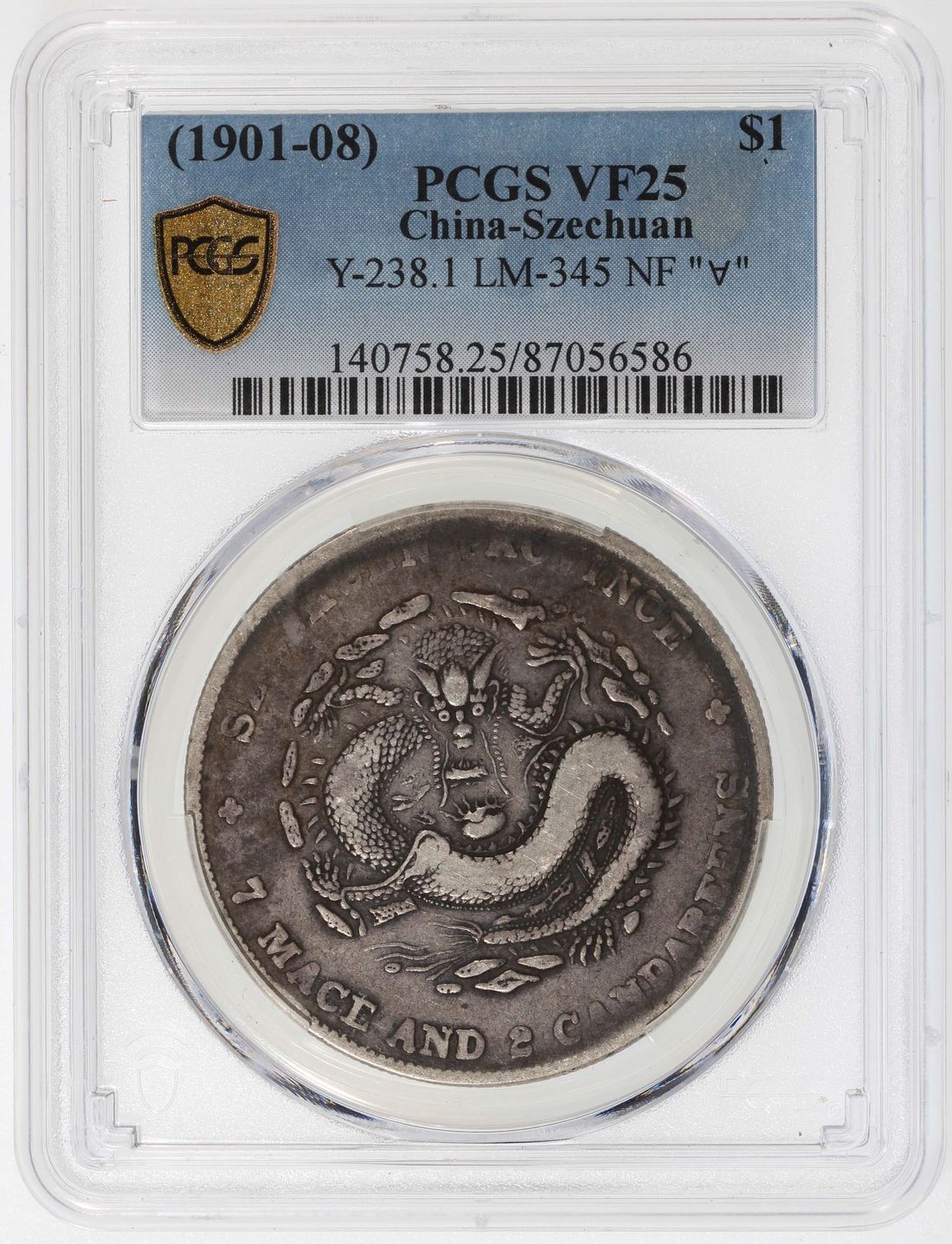 China, Qing Dynasty, Szechuan Province, [PCGS VF25] silver dollar, ND(1901-08), 'Guangxu Yuan Bao', narrow dragon face and inverted 'A' variety, (LM-345, Y-238.1), Cert.# 87056586