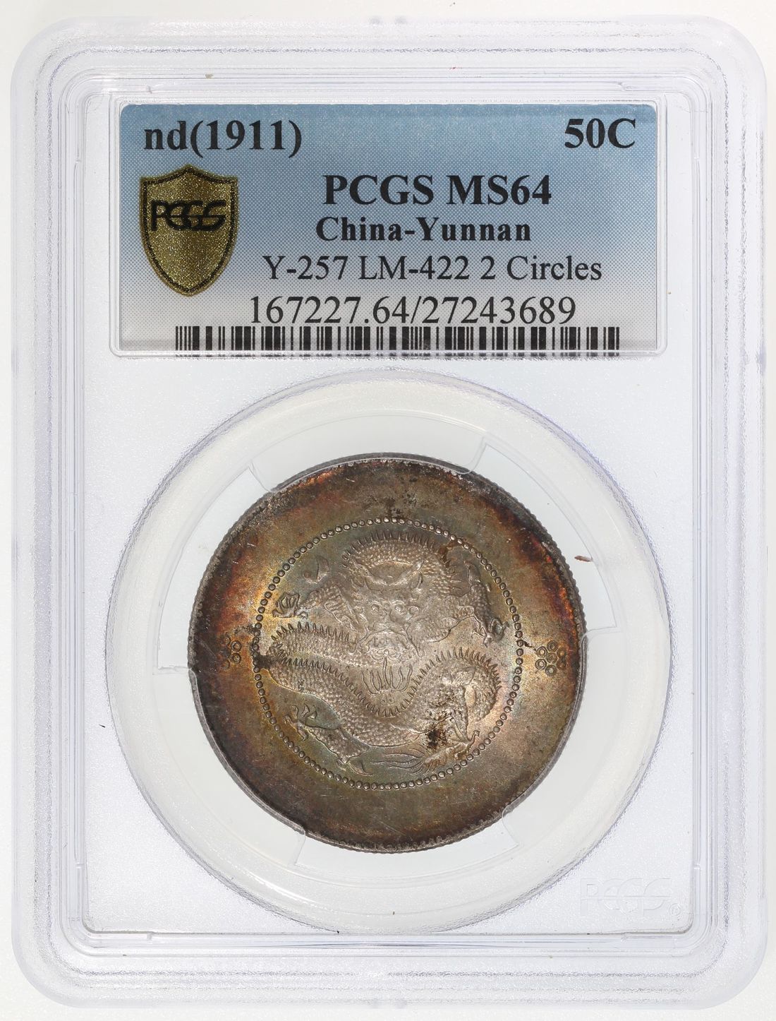 China, Qing Dynasty, Yunnan Province, [PCGS MS64] silver 50 cents, Guangxu Yuan Bao, 'New Dragon', ND(1911), 2 circles, LM-422, with mint luster and golden rim toning. Cert.# 27243689