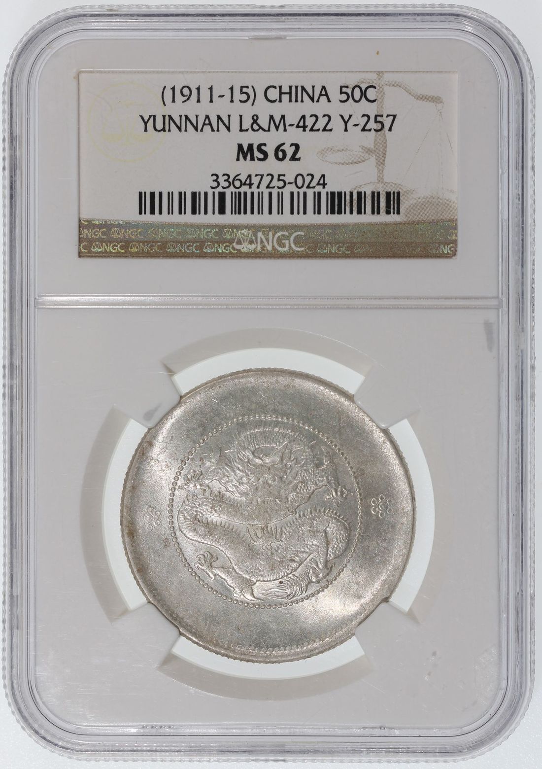 China, Qing Dynasty, Yunnan Province, [NGC MS62] silver 50 cents, Guangxu Yuan Bao(1911-15), New Dragon, (LM-422), good mint luster. Cert.# 3364725-024
