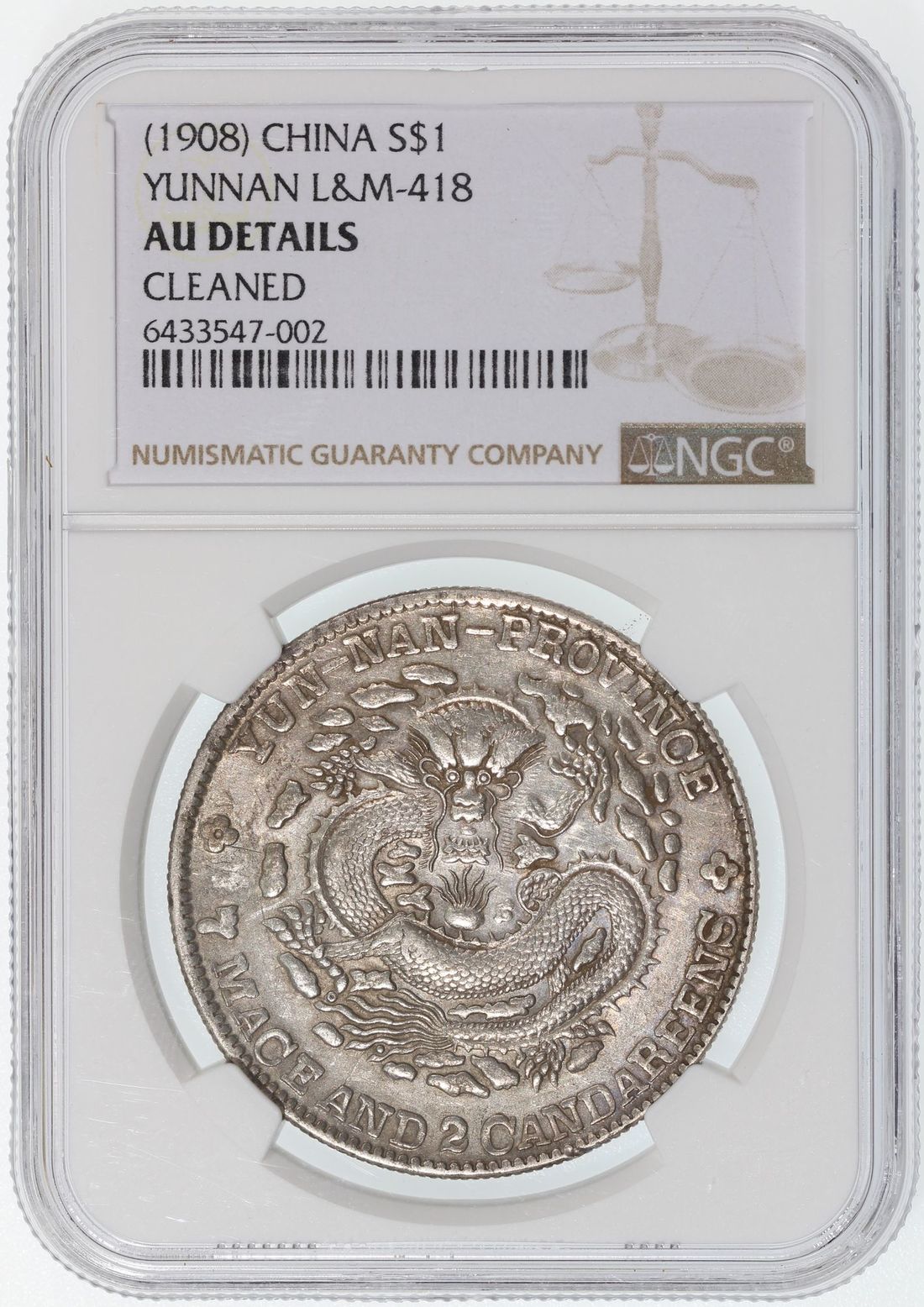 China, Qing Dynasty, Yunnan Province, [NGC AU Details] silver dollar, Guangxu Yuan Bao, 1908, (LM-418), cleaned. Cert.# 6433547-002