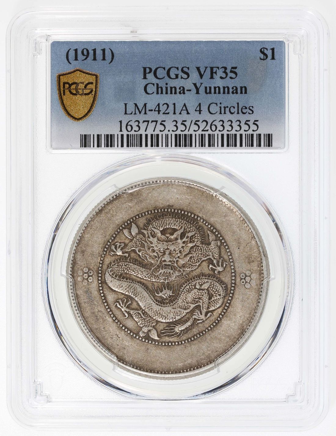 China, Qing Dynasty, Yunnan Province, [PCGS VF35] silver dollar, ND (1911), 'Guang Xu Yuan Bao', new dragon, 4 circles under fiery pearl variety, (K-169, LM-421A), Cert. #52633355, mottled grey toning throughout