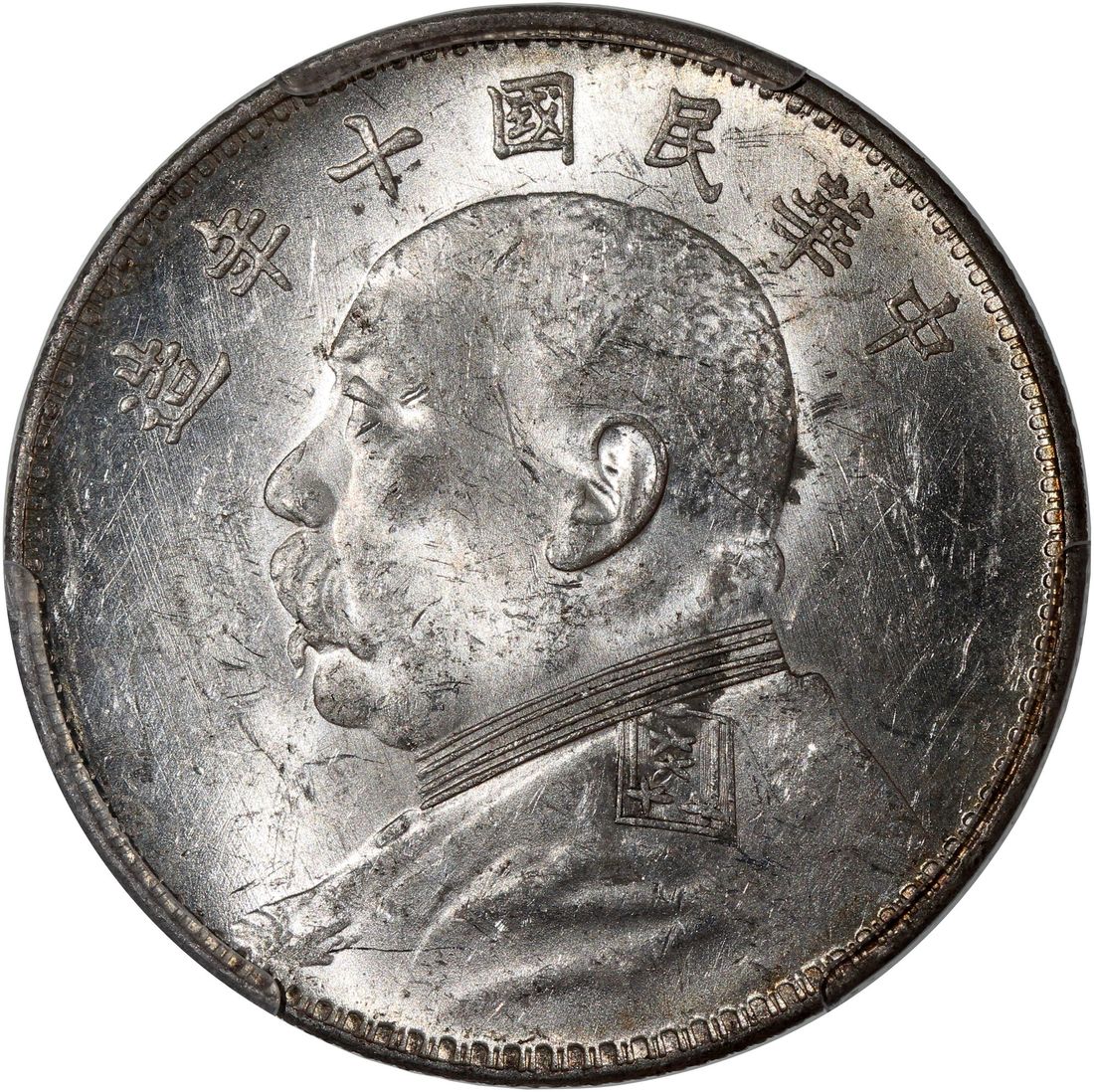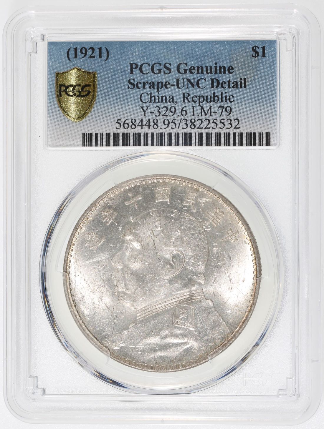 China, Republic, [PCGS UNC Details] silver dollar, Year 10 (1921), "Square shoulder patches" type, 'Yuan Shih Kai' (LM-79, KM-Y-329.6), scrape. #38225532. Despite some scraping on both sides, still a lovely example with much original luster. Uncommon variety