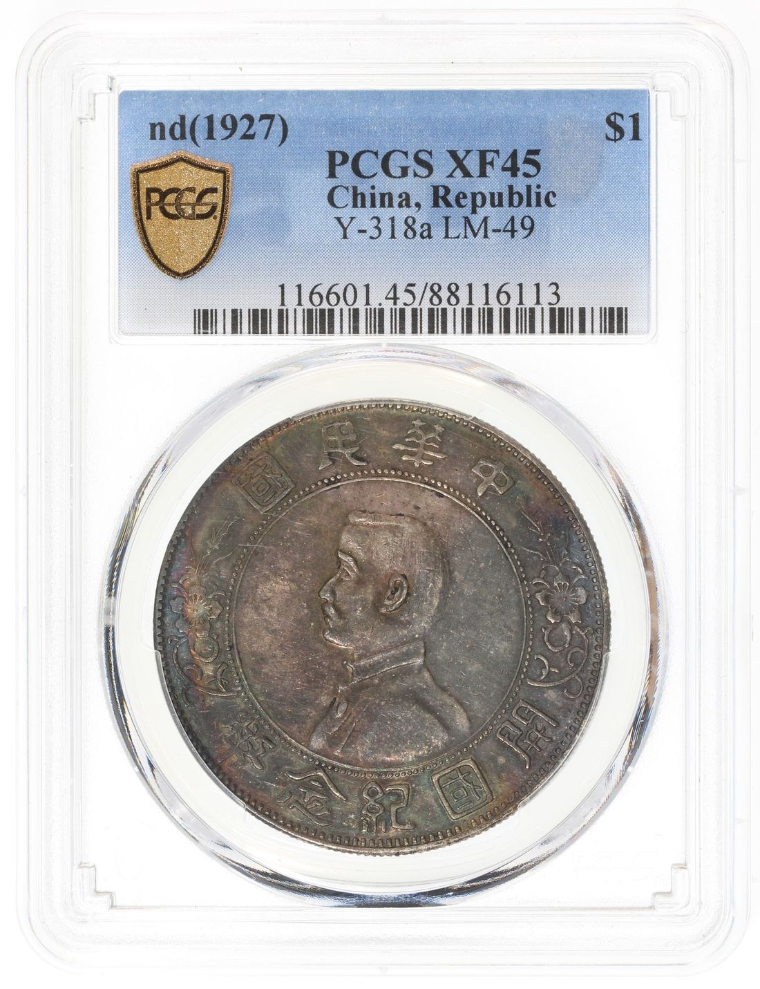 China, Republic, [PCGS XF45] silver dollar, ND(1927), Memento, 3 leaves at left and right, (LM-49C), with metal blue toning on obverse, Cert.# 88116113, only noted as LM-49 on the PCGS label