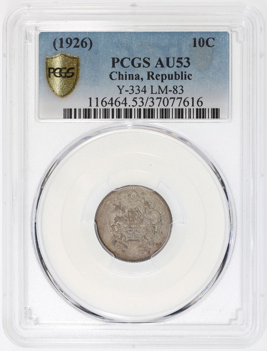China, Republic, [PCGS AU53] silver 10 cents, Year 15 (1926), 'dragon and phoenix', (LM-83, KM-Y-334), Cert. #37077616, muted pewter toning with flashes of red near the bottom