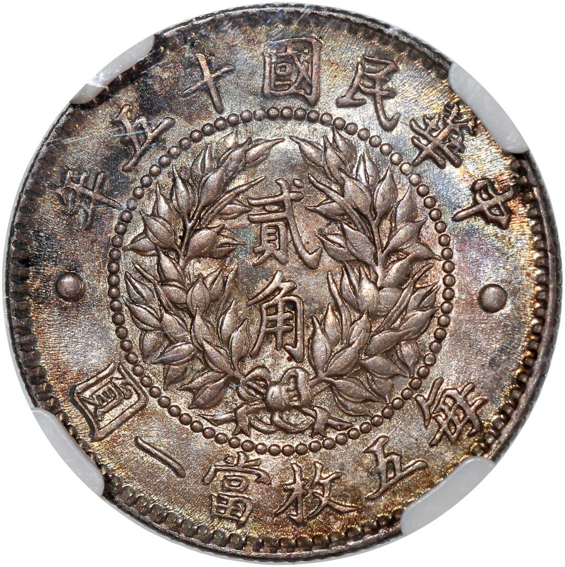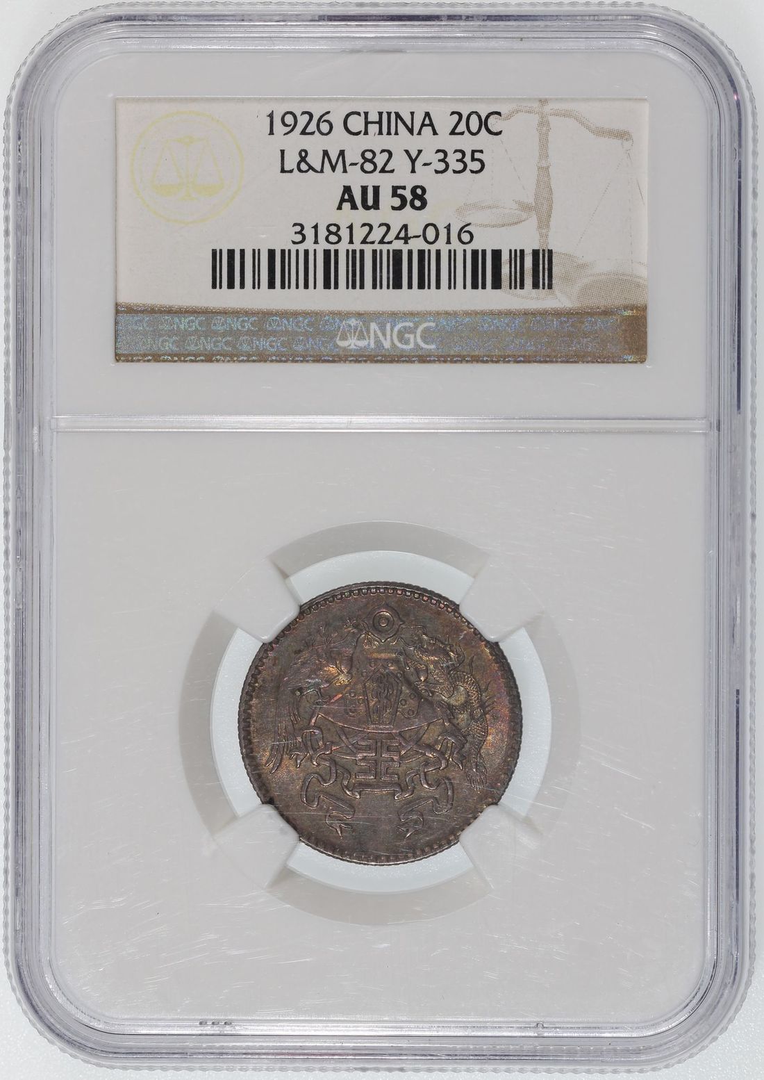 China, Republic, [NGC AU58] silver 20 cents, Year 15 (1926), 'dragon and phoenix', (LM-82, KM-Y-335), Cert. #3181224-016, only very gently circulated with highly attractive opalescent tones throughout