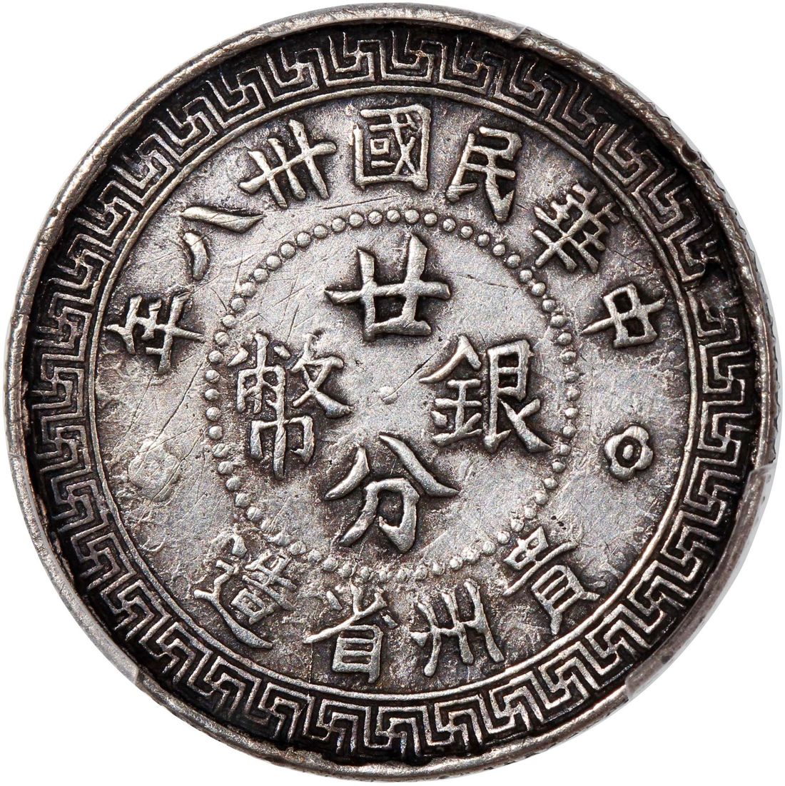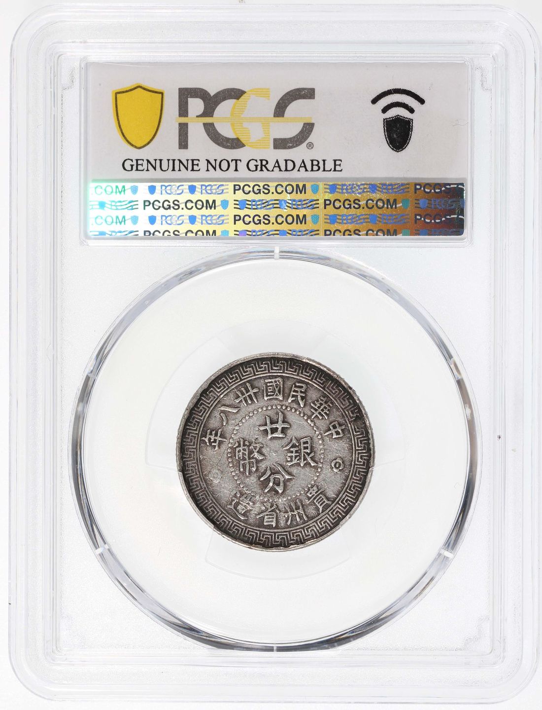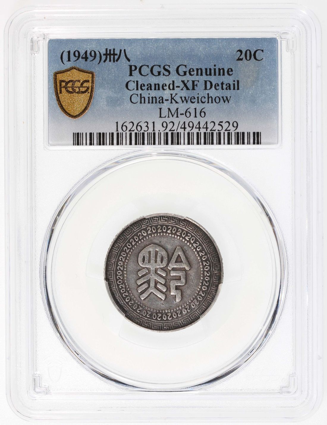 China, Republic, Kweichow Province, [PCGS XF Detail] silver 20 cents, Year 38(1949), Chinese character 'Qian' on reverse, (LM-616, KM-Y-430), Cleaned, Cert. #49442529, nice dark toning which gradates towards the peripheries. Examples in any condition are hard to come by, scarce