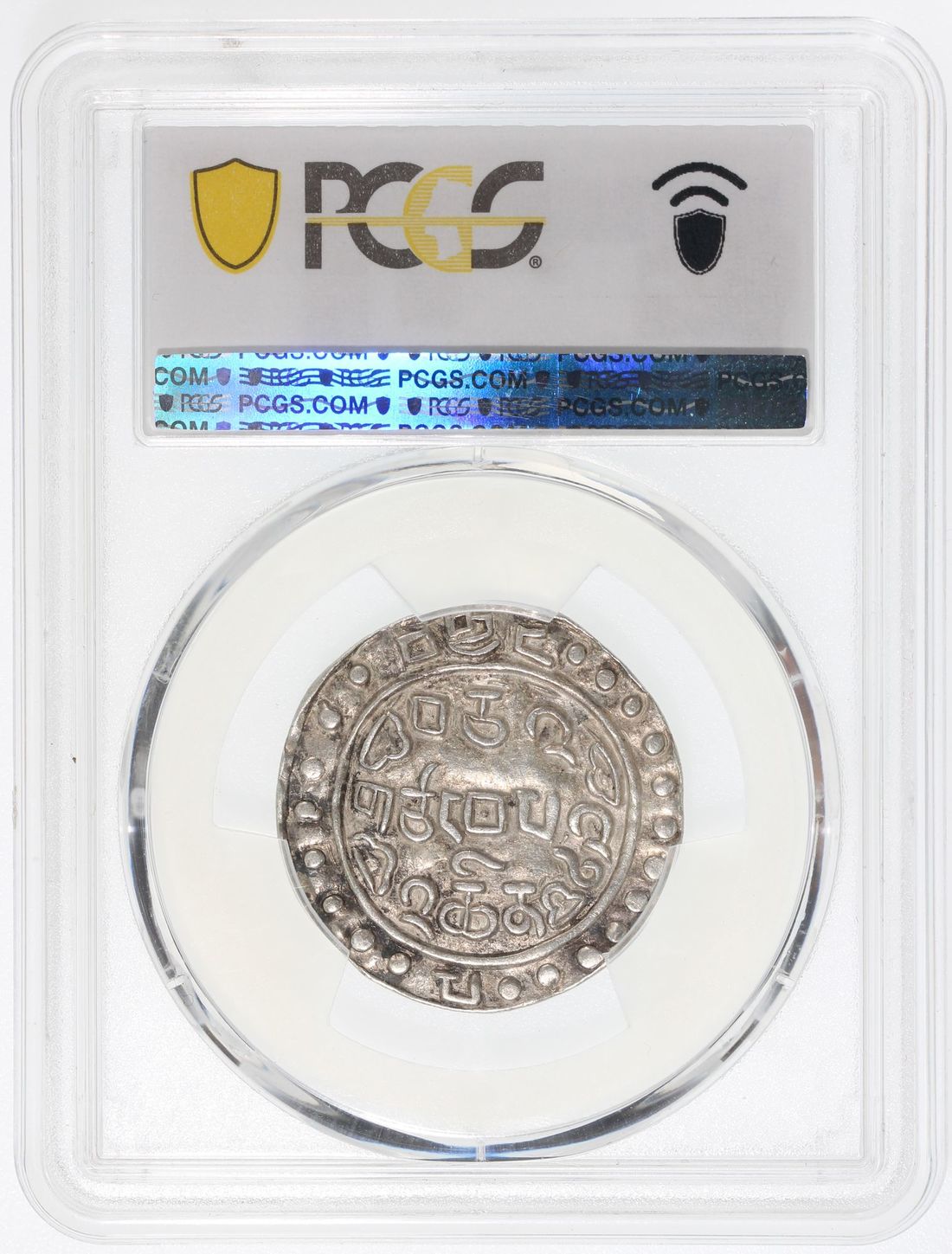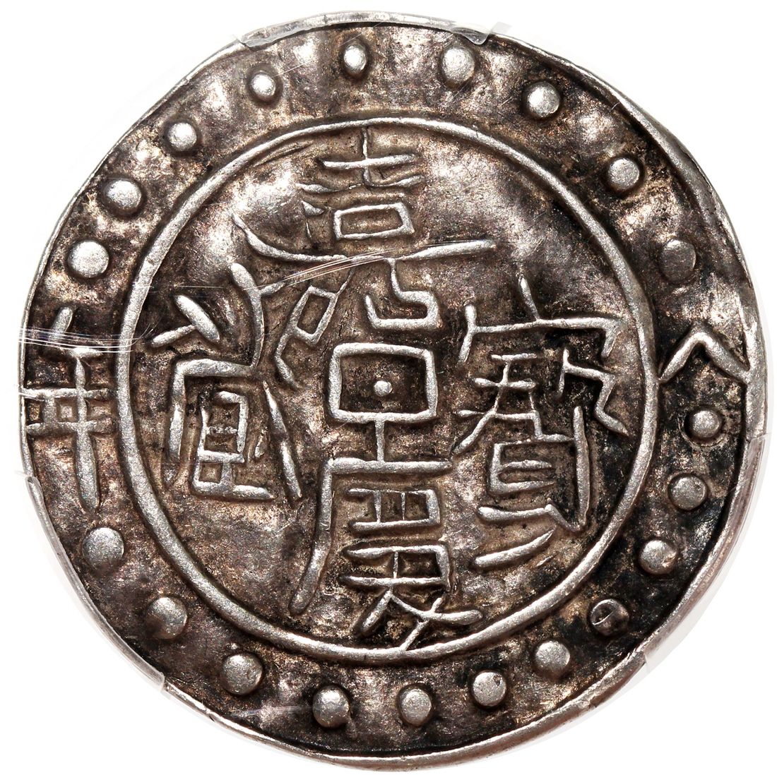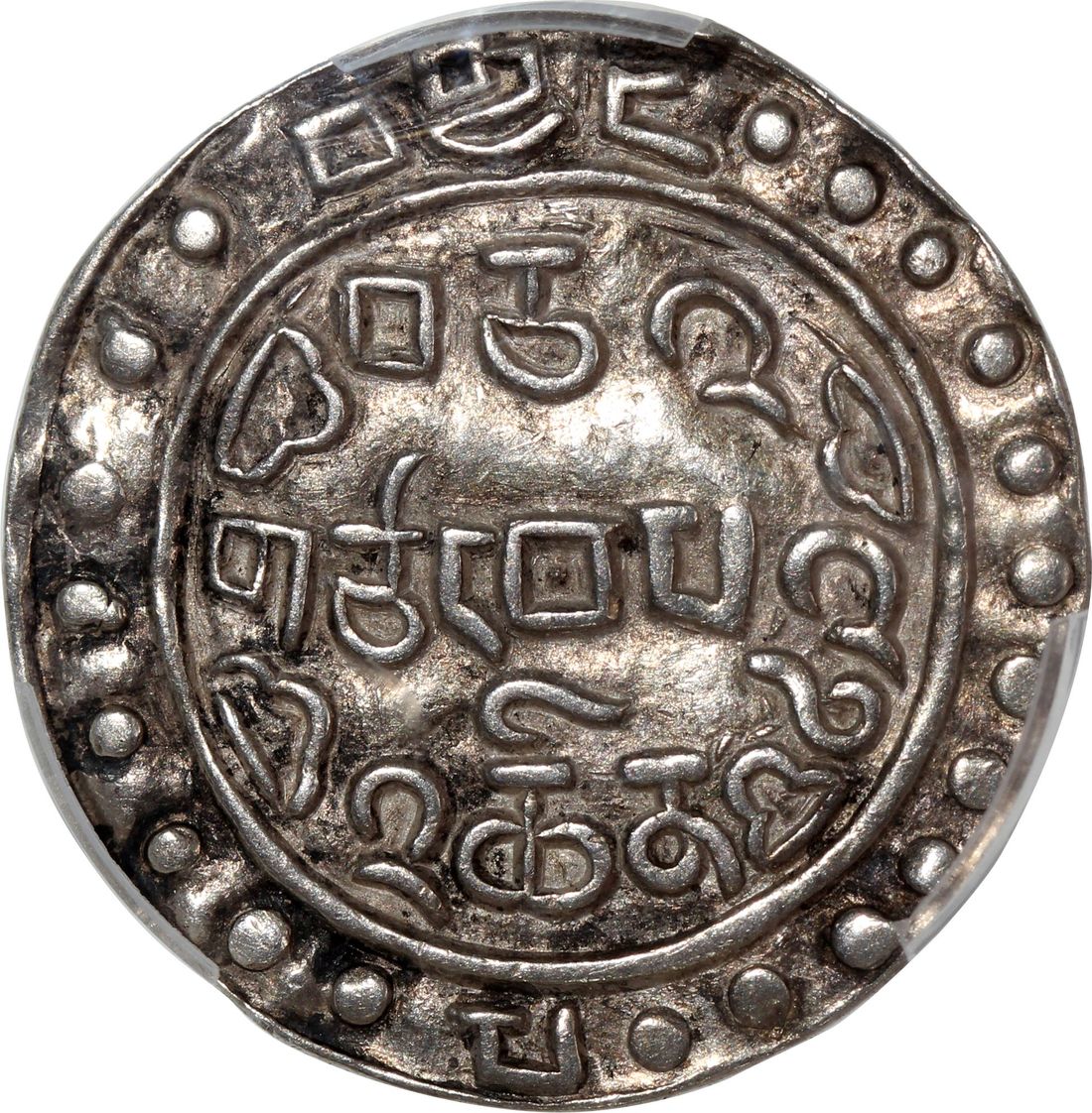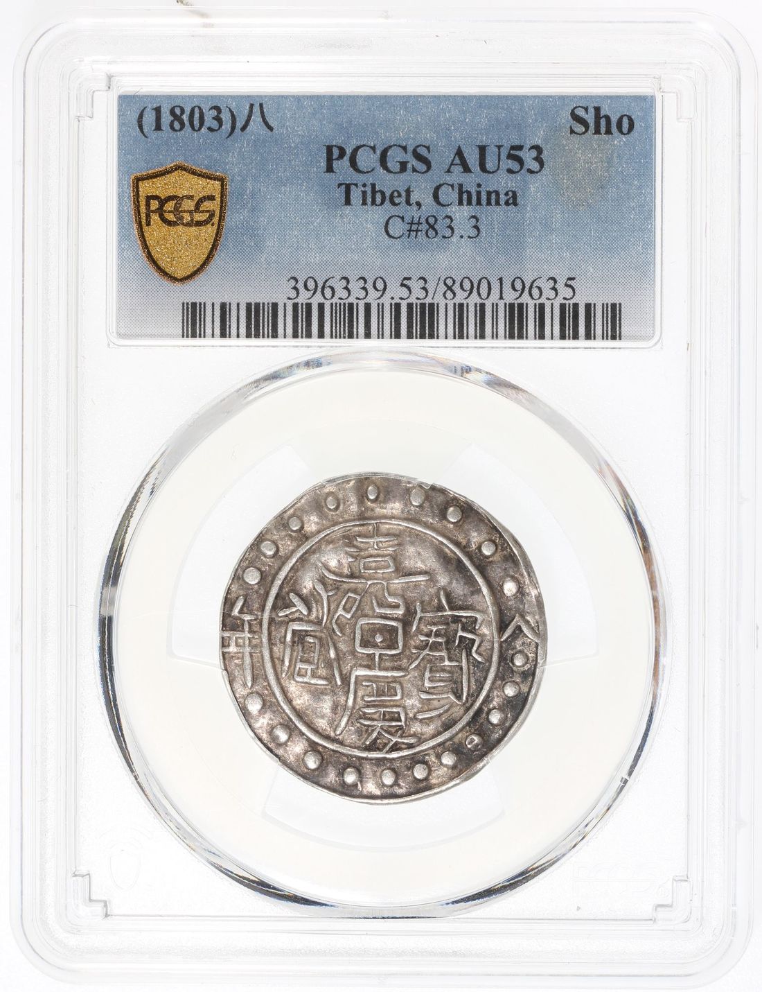 China, Tibet, [PCGS AU53] silver sho, 8th year of Jian Qing (1803), 3.66g, (C#83.3), 20 beads, 9 in top section, 11 below, date near the rim: 'Ba Nian' (eighth year), the first character at 3 o'clock, the second at 9 o'clock, rev. 20 beads, 8 on left, 12 on right side of date, Tibetan legend reads "bca' "(three letters) instead of "ca' "(two letters), date: brgyad pa (eighth), the first character at 12 o'clock and the second at 6 o'clock,