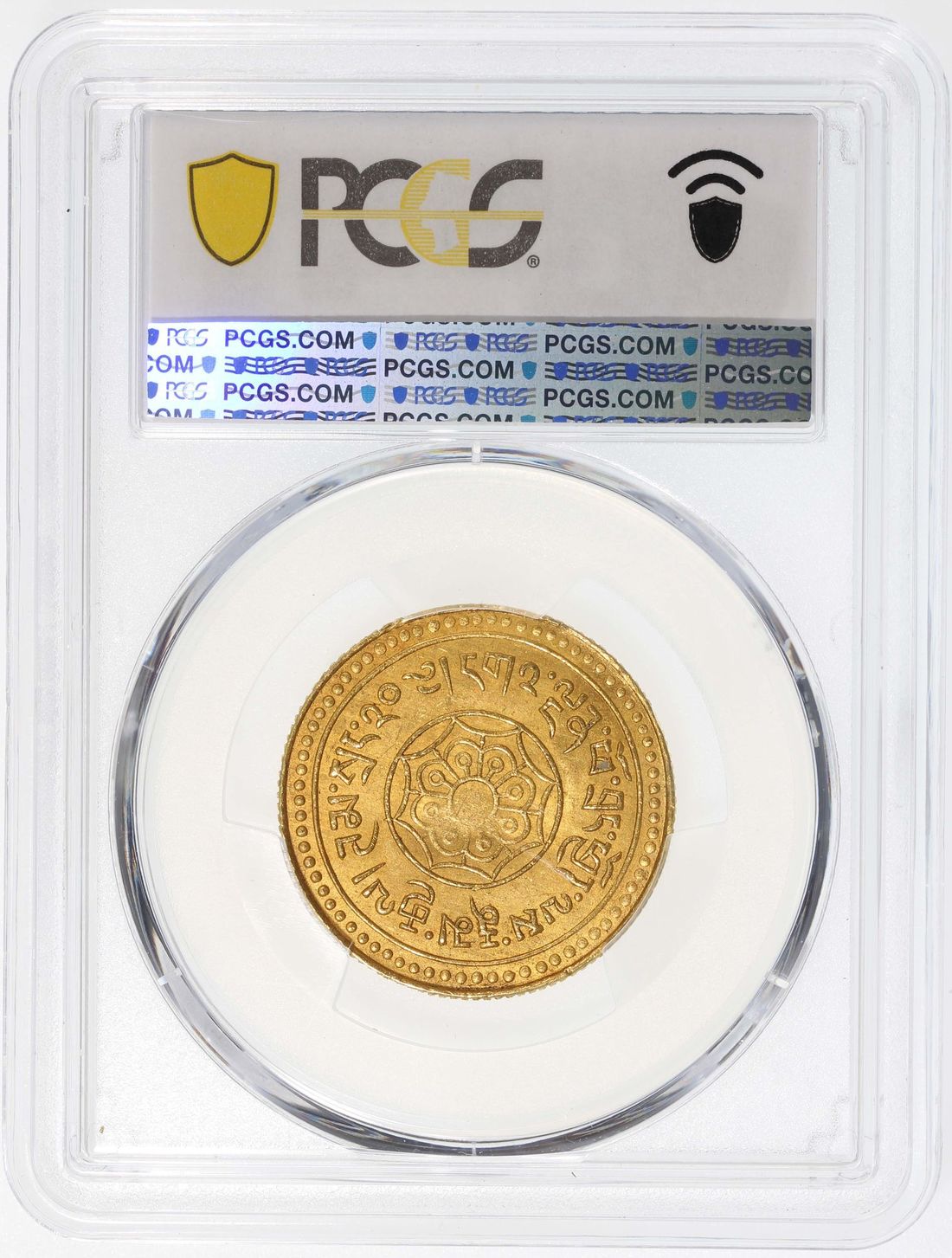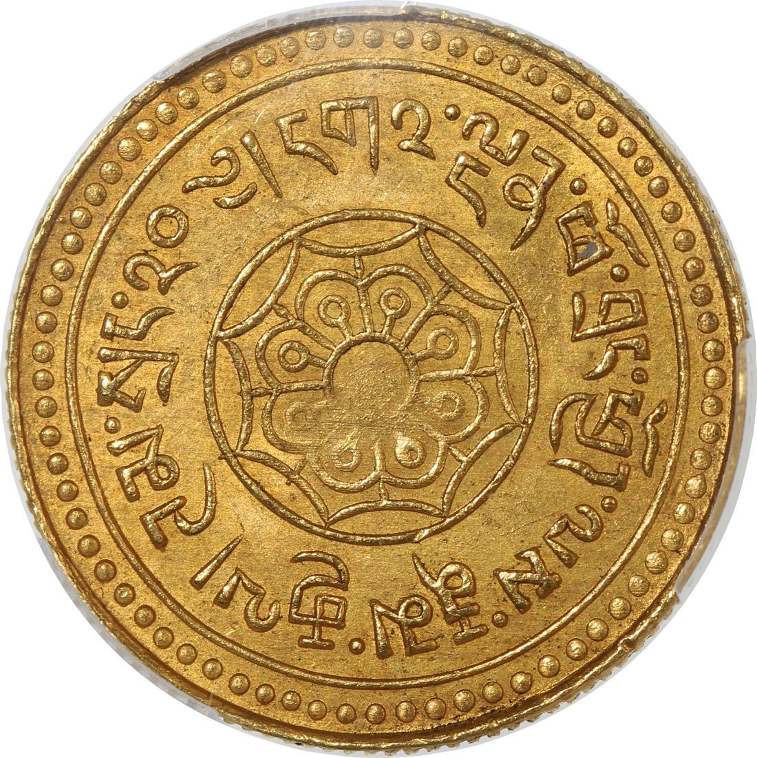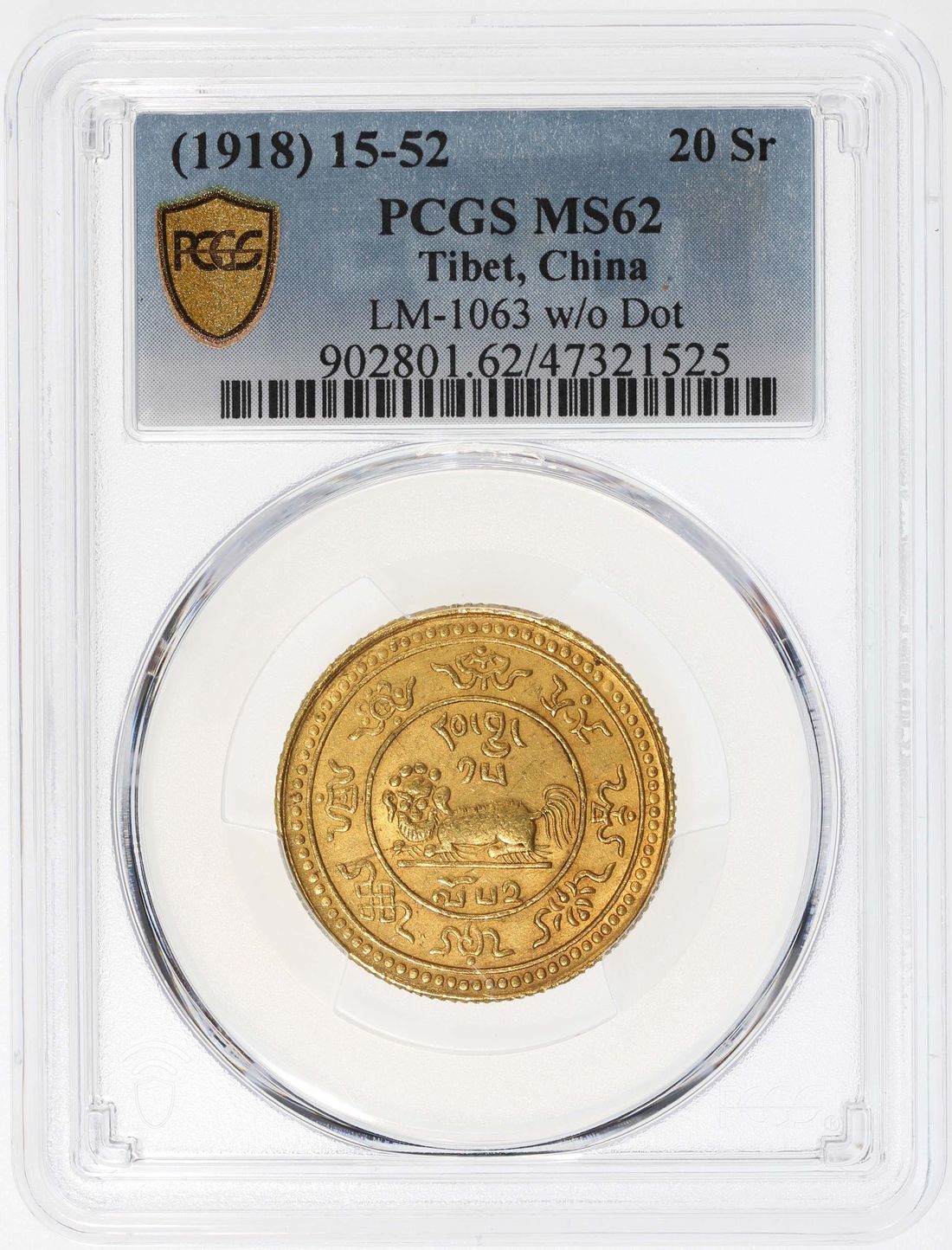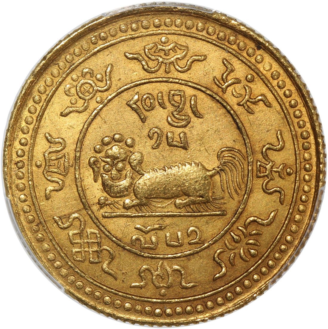China, Tibet, [PCGS MS62] gold 20 tam srang, 15-52 (1918), snow lion facing left, the words rab byung 15 ("cycle 15") above and lo 52 ("year 52") below,