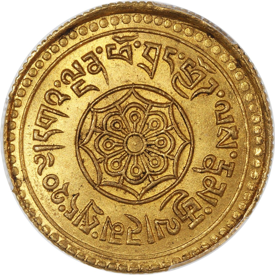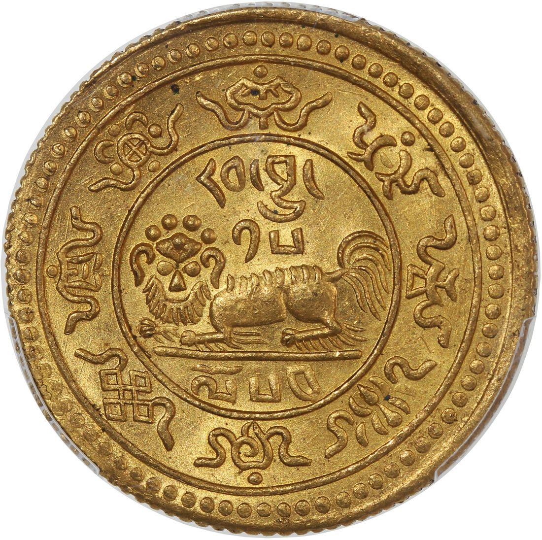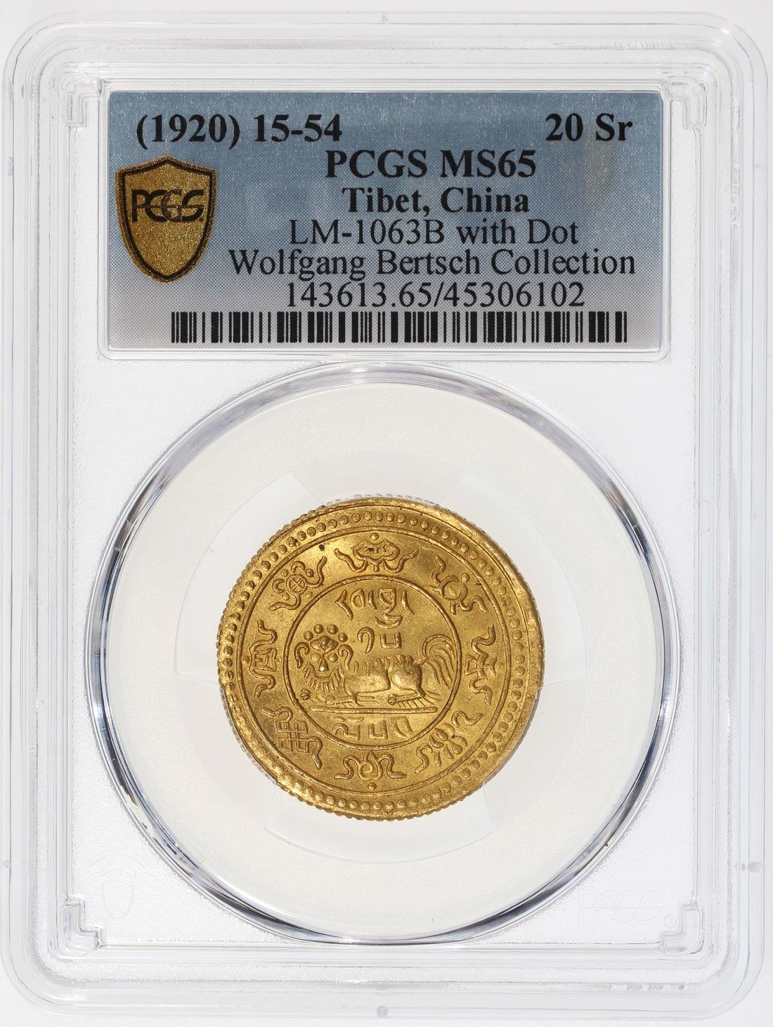 China, Tibet, [PCGS MS65] gold 20 tam srang, 15-54 (1920), 12.06g, snow lion facing left, the words rab byung 15 ("cycle 15") above and lo 54 ("year 54") below,