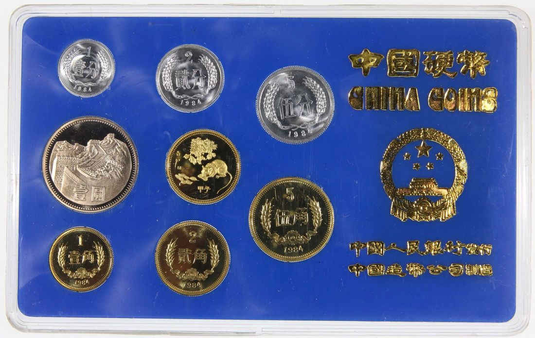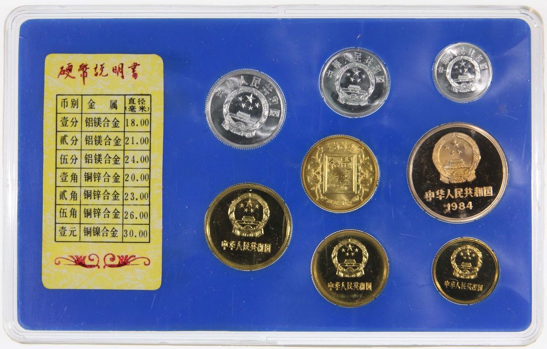 People's Republic of China, a proof coins set of 1984, consisting of 1, 2, 5 fen, 1, 2, 5 jiao, 1 yuan and a medallion of rat, well preserved in original plastic holder, the copper coins with minor stain, generally brilliant uncirculated.(8/set)
