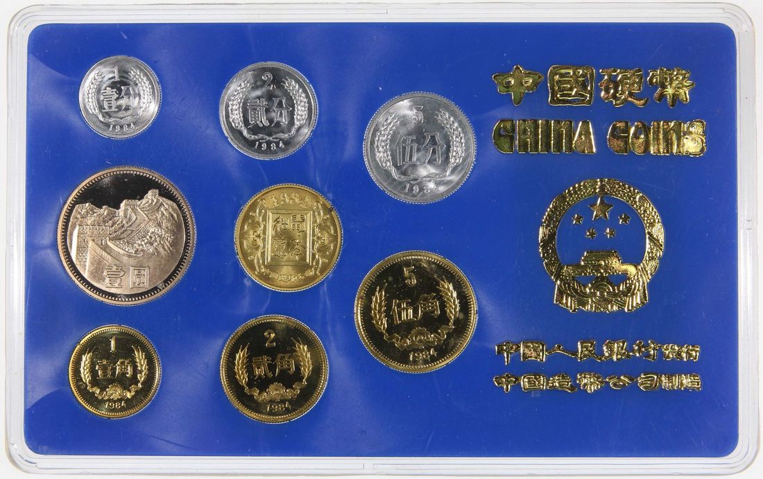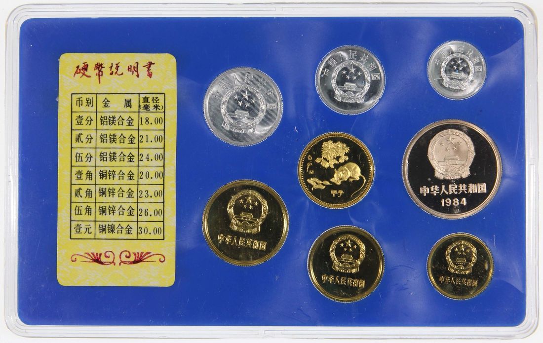 People's Republic of China, a proof coins set of 1984, consisting of 1, 2, 5 fen, 1, 2, 5 jiao, 1 yuan and a medallion of rat, well preserved in original plastic holder, the 2 and 5 jiao with minor foxing, generally brilliant uncirculated.(8/set)