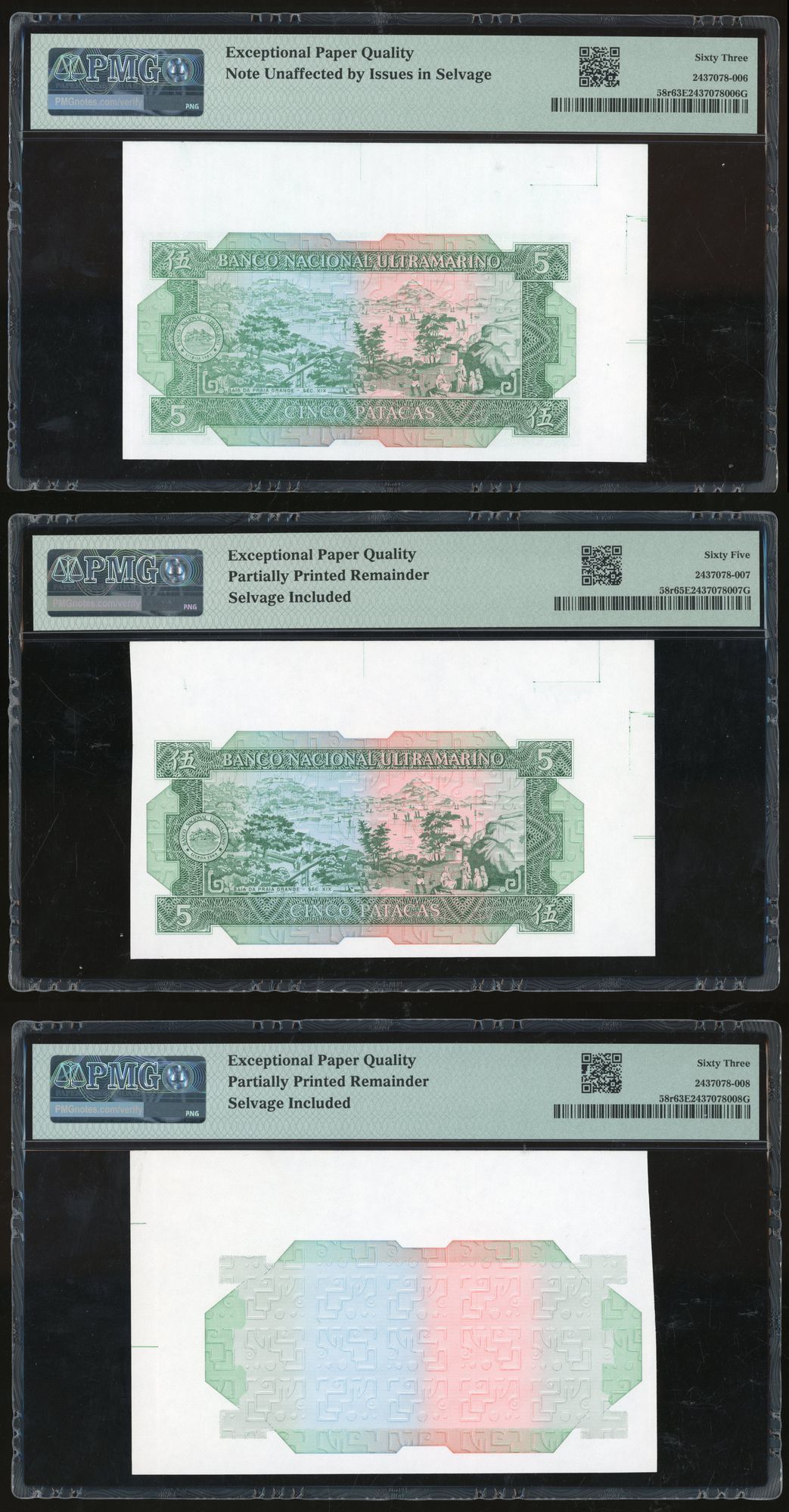 Banco Nacional Ultramarino, Macau, a group of 3x progressive proofs 5 patacas, ND (1981), each note showing a different stage in printing with 1 showing a fully printed design,