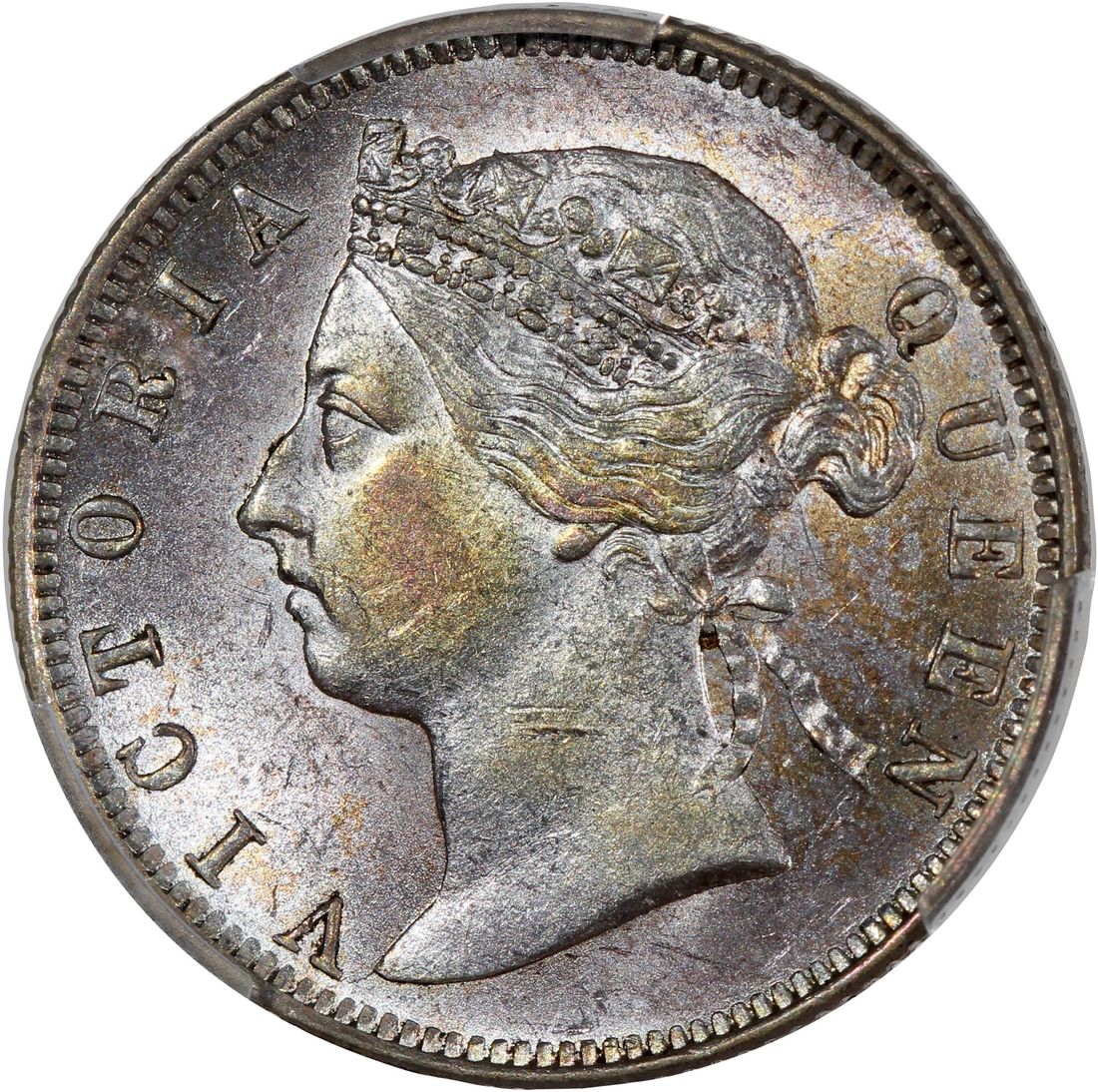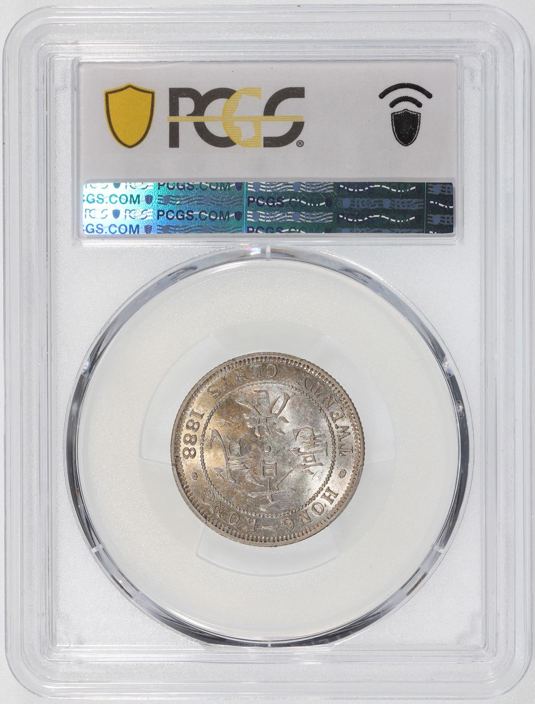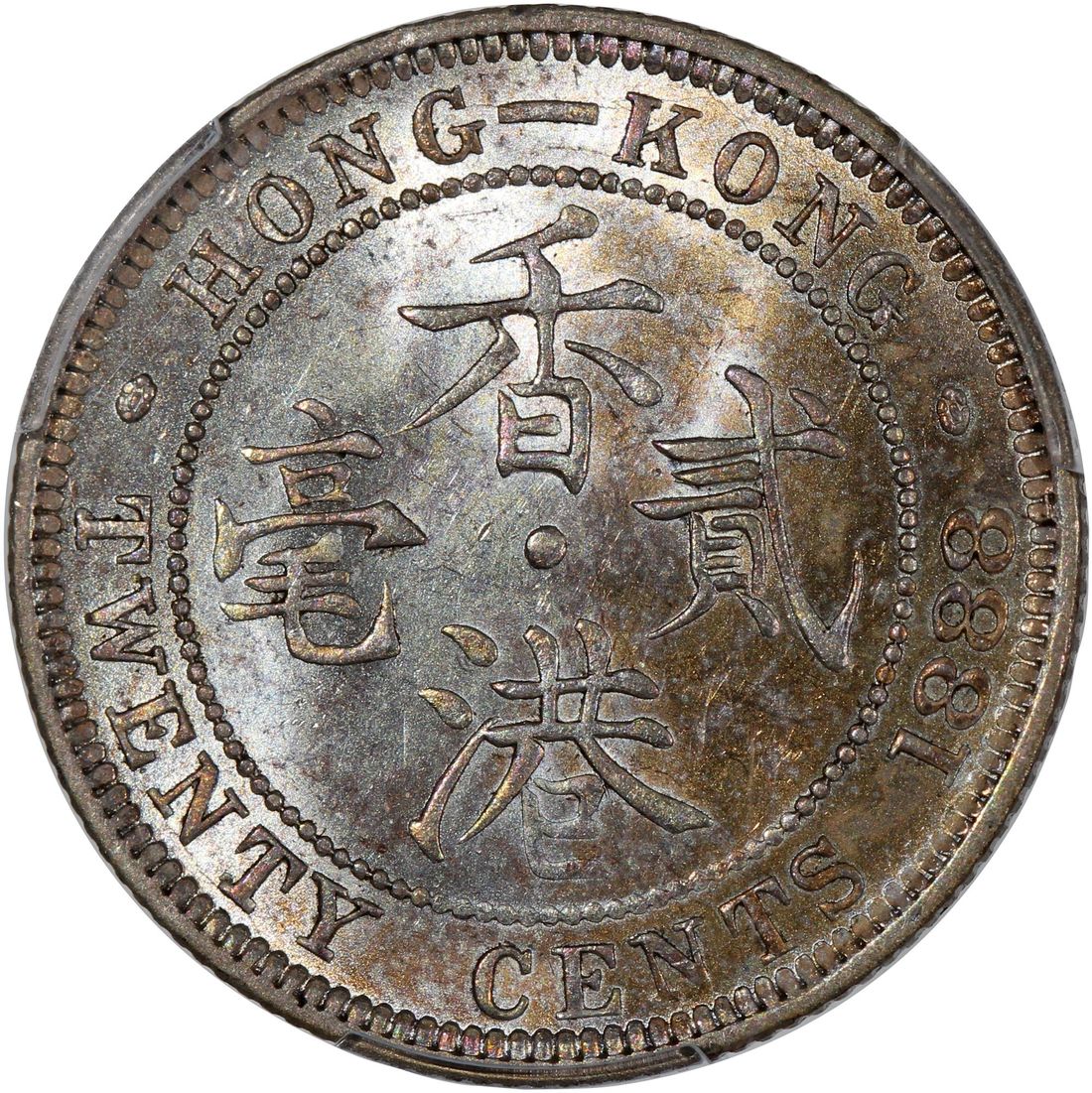 Hong Kong, [PCGS MS61] silver 20 cents, 1888, Victoria on obverse, (KM-7), Cert. #52760877, A shimmering example with multi-coloured toning throughout, with a distinctive yellow 'blush' on the cheek of Victoria
