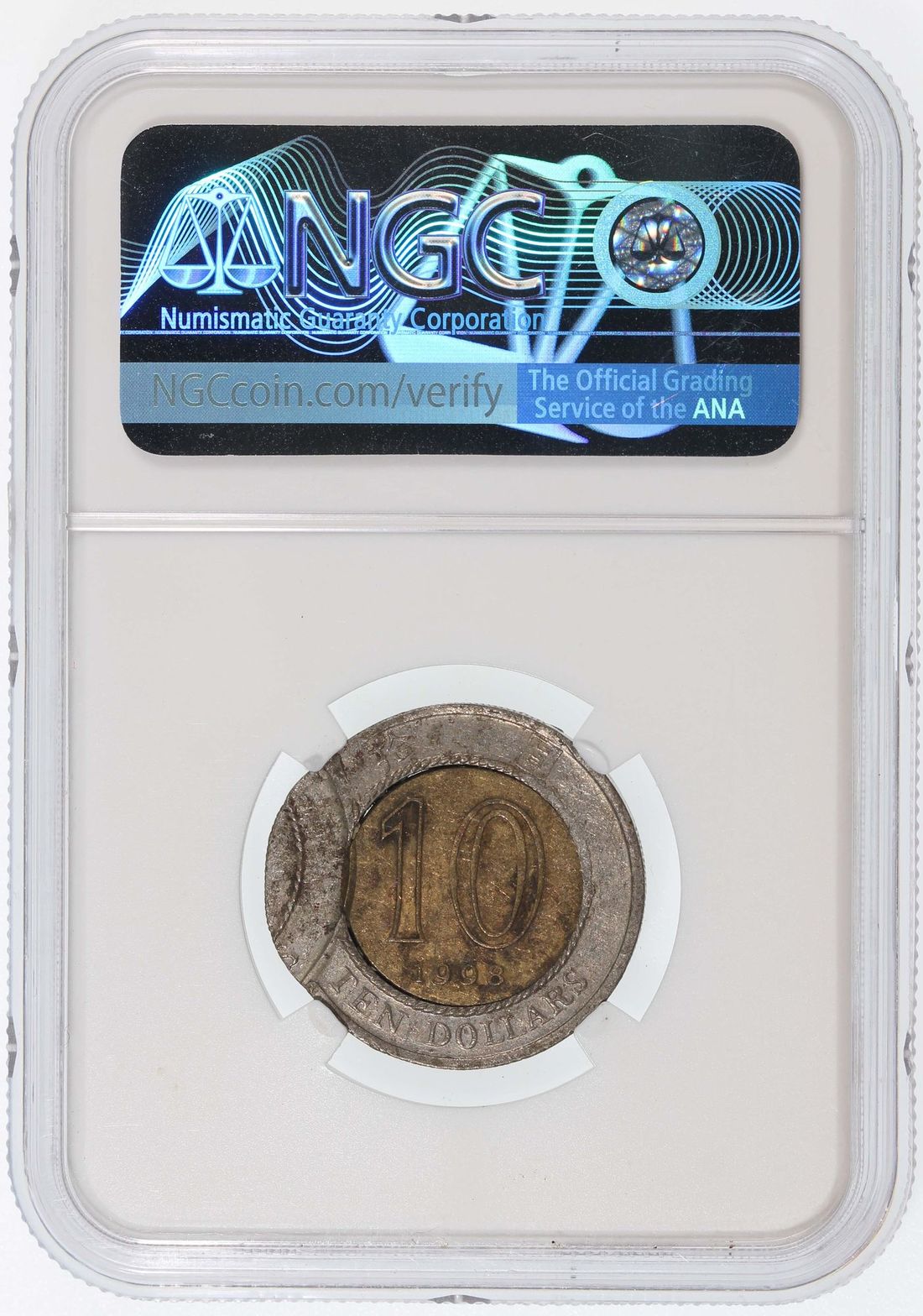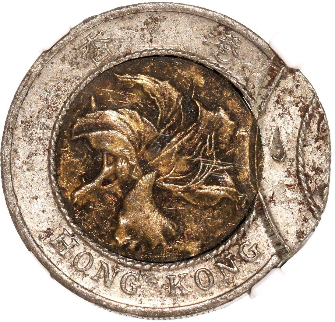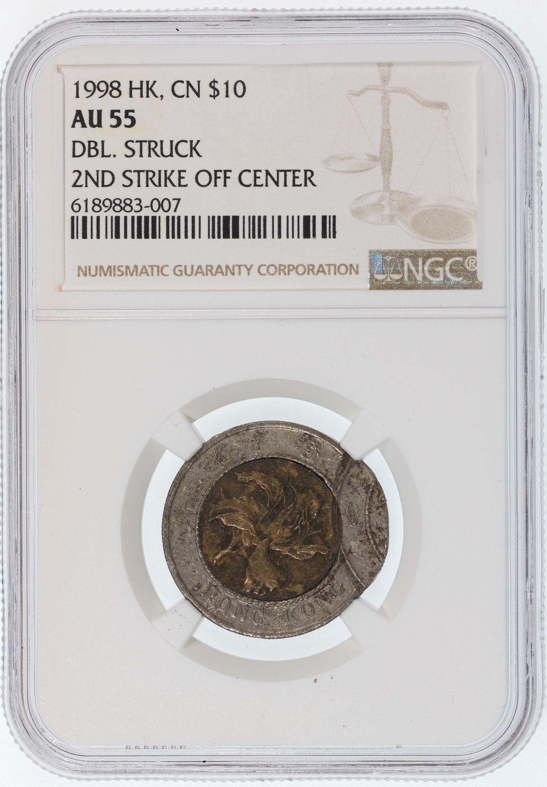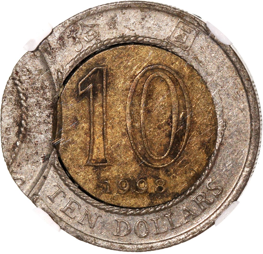 Hong Kong, [NGC AU55] MINT ERROR copper nickel $10, 1998, double struck, 2nd struck off centre, unissued year, rare. Cert. 6189883-007