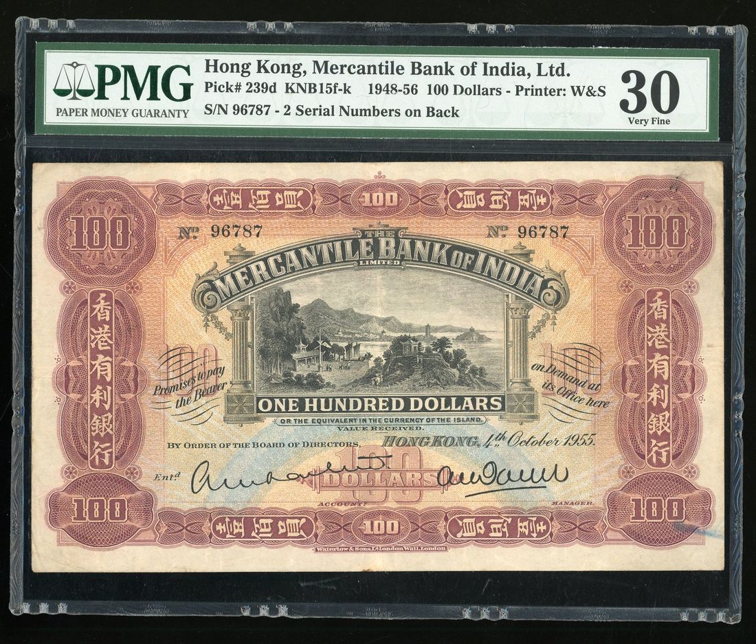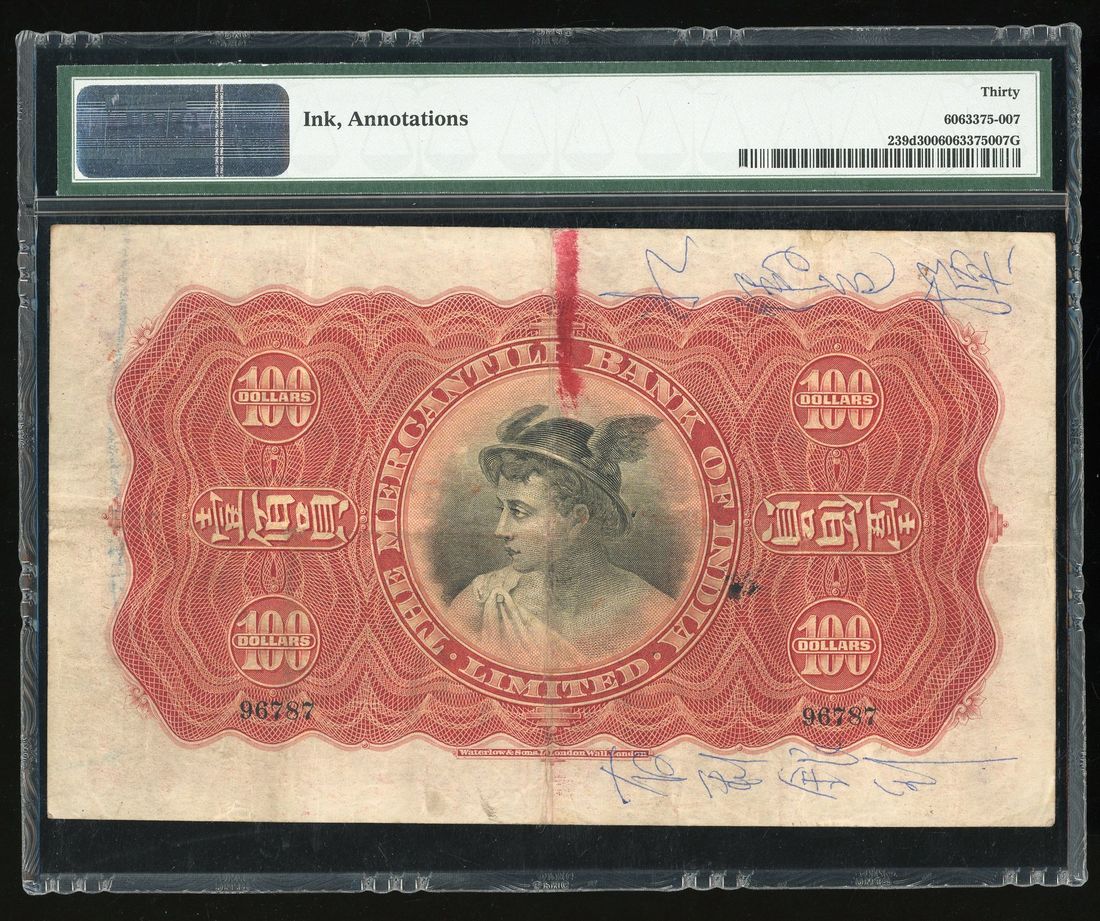 Mercantile Bank of India, Hong Kong, $100, 4.10.1955, serial number 96787, (Pick 239d), PMG 30, ink, annotations.
