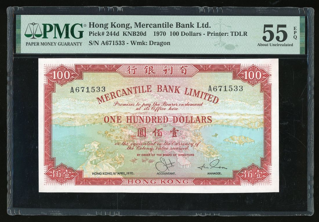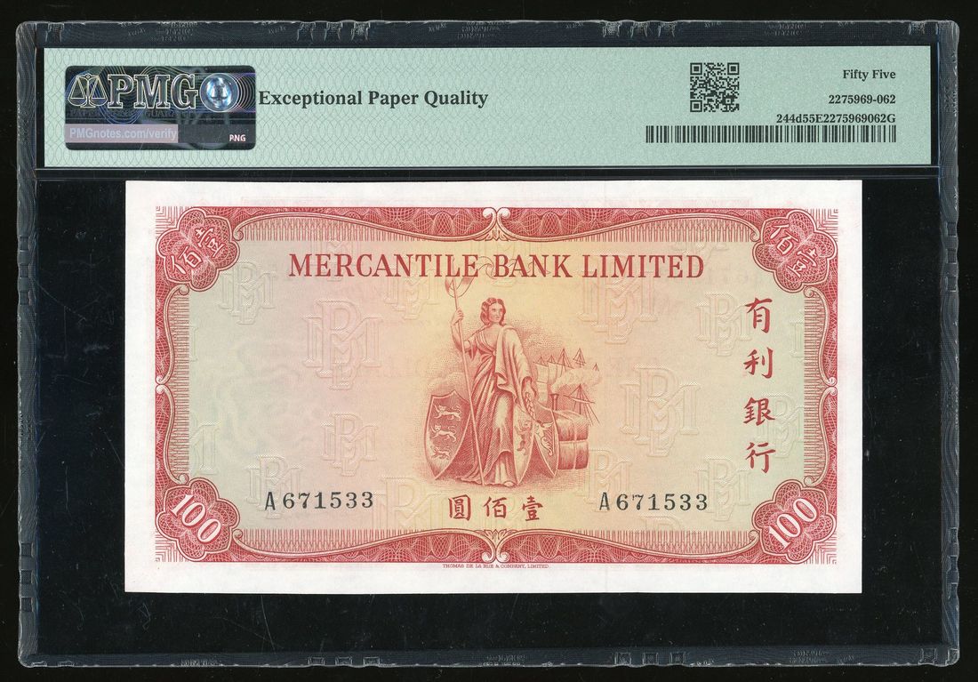 Mercantile Bank, Hong Kong, $100, 16.4.1970, serial number A 671533, 'map', (Pick 244d), PMG 55EPQ. Original example, consecutive to the previous lot