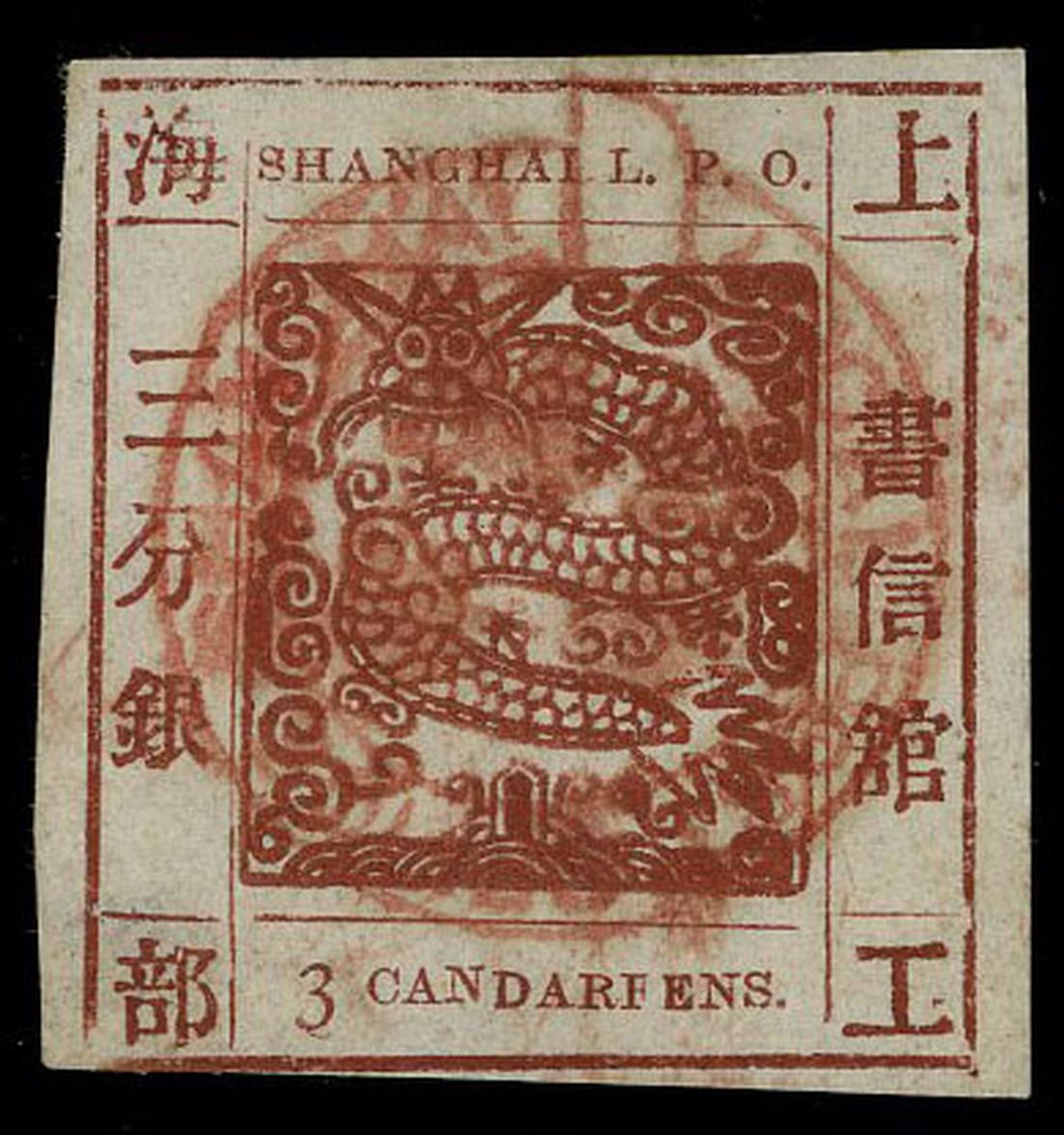 1865 large dragon 3cds used with LOCAL POST OFFICE SHANGHAI small garter cancellation, printing #50. Rare. Photo