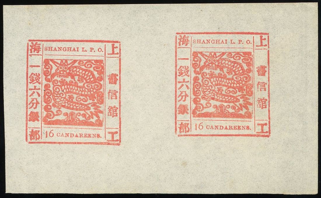 1865 Municipal Post Shanghai Large Dragons, 16 Cands. Red, horizontal pair. Fine.