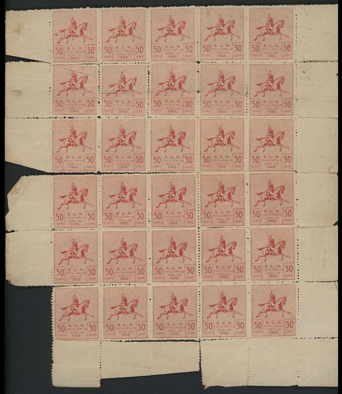 Shanghai Light Horse Postal Service: 1922 50c carmine, depicting Cavalryman on horseback, inscribe ''S.L.H./ POSTAL SERVICE/ HUNG JAO/ 1922'', no watermark, perf 12 1/2, part sheet of thirty (5x6) with part marginal selvedge at left, right and foot, unused with original gum, extensively creased with much splitting between the stamps, BPA certificate included.