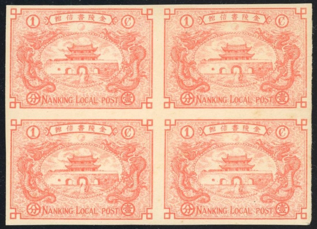 1896 First Issue 1c block of four imperforate, one stamp torn. Chan LN2a