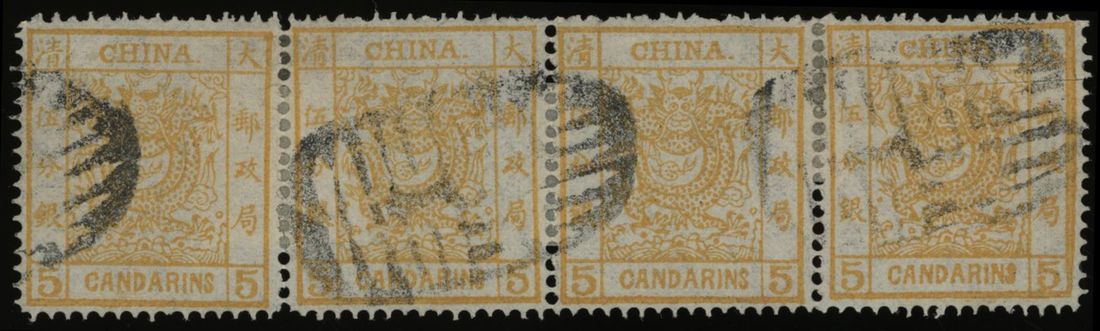 5cds strip of four cancelled by large type Tientsin seal. Chan 3.