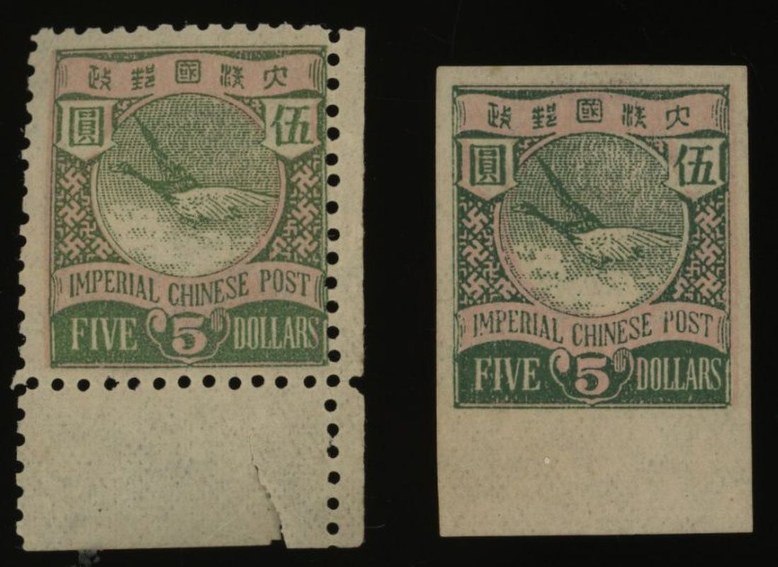 $5 flying geese imperforate x 2, one has been reperforated.