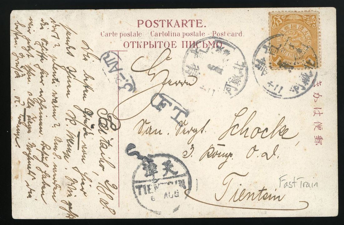 1908 (2 August) Train mail postcard from Pei-Tai-Ho to Tientsin with oval 'F.T.' (Fast Train) and hand-stamp '3-AM' with Tientsin arrival. Very rare.