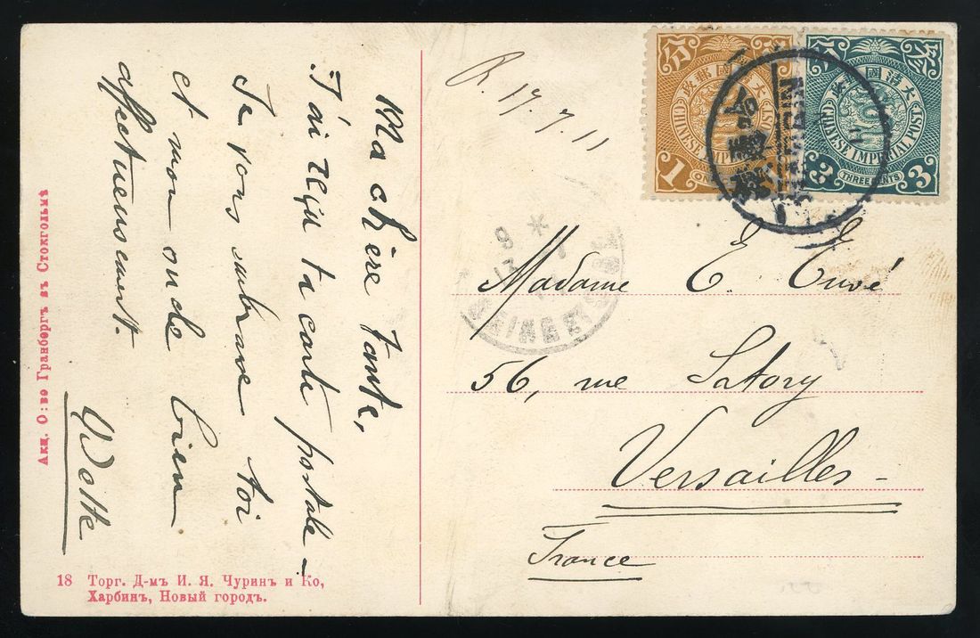 1911 Picture postcard of 'Palace of General Tscitagoff, Kharbin' addressed to France bearing coiling dragon 1c & 3c tied by Harbin cds with Versailles arrival. Ex Desrousseaux.