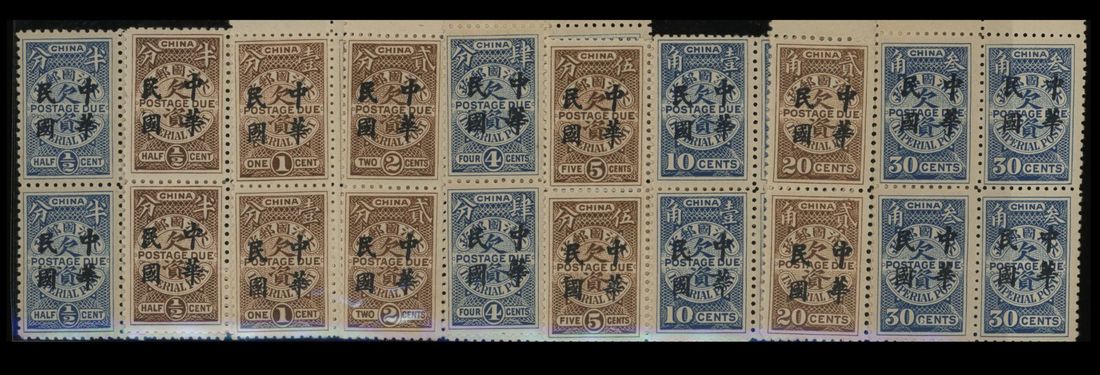 1912 Republic of China overprint on postage due issue complete set in blocks of four mint full gum. Scarce. Chan D23-31.