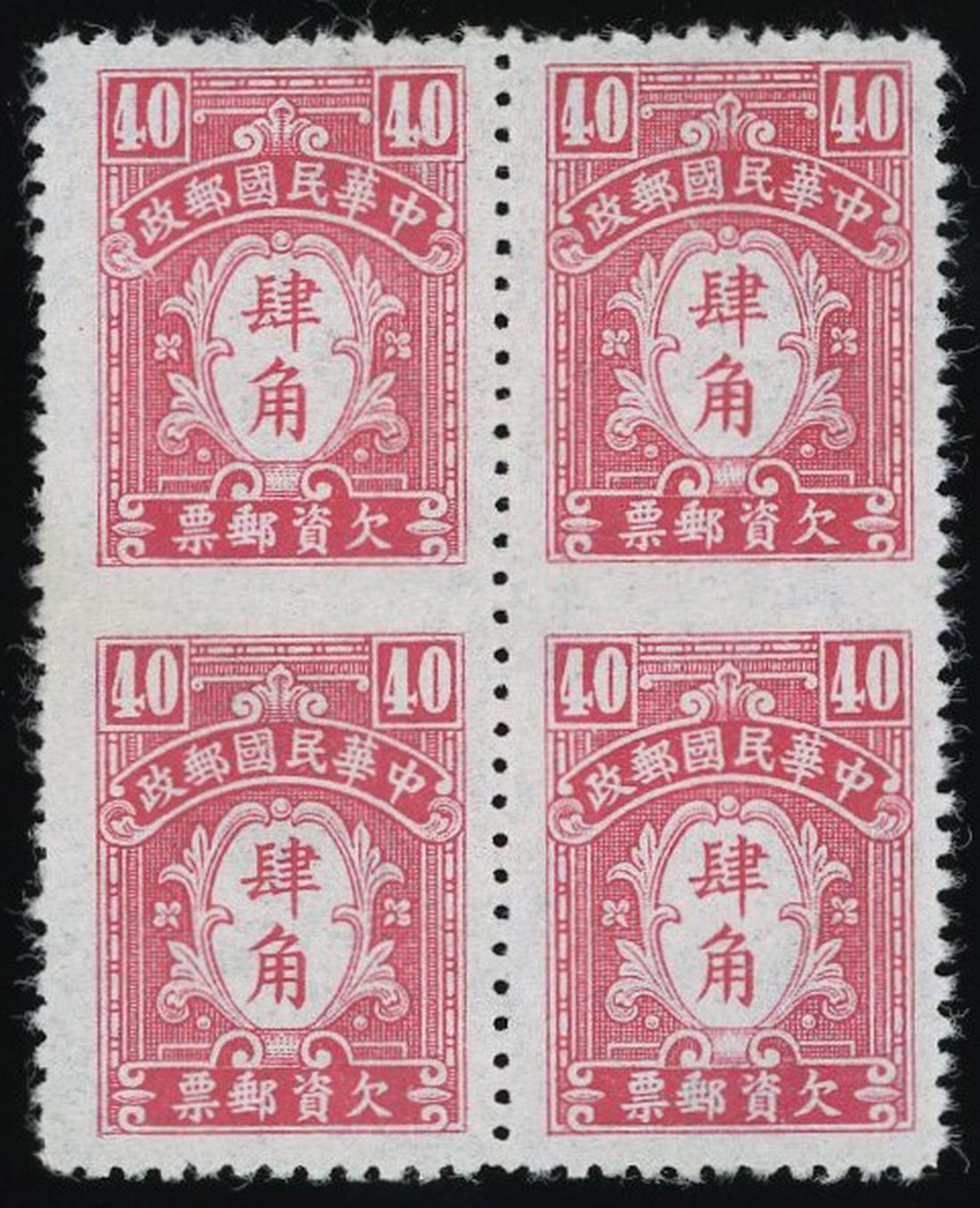 1944 Postage Due First Central trust Print 40c block of four with imperforate horizontal perforations variety, extremely rare and unlisted. Ex Interasia November 2014. Chan D88var.