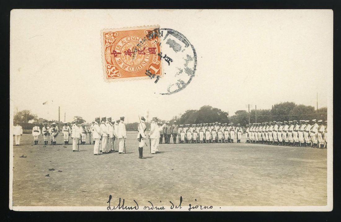 1913 (21 July 1913) photographic picture postcard of 'The Italian Troops on Parade at Shanghaikwan' addressed to Rome bearing ROC coiling dragon 1c tied by Shanghaikwan cds. Very fine and scarce item paying the printed matter rate.