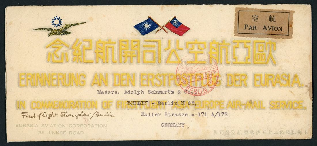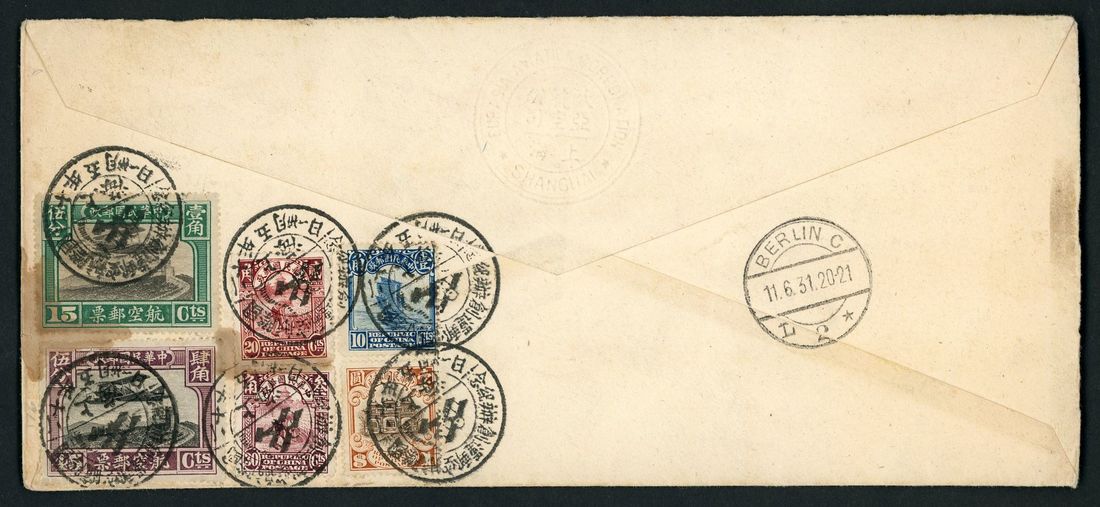 1931 (11 June) First Flight Cover from Shanghai to Berlin bearing 2nd airmail issue 15c & 45c, Junk 10c, Reapers 20c & 30c and Hall of Classics $1 tied by special commemorative cancel.