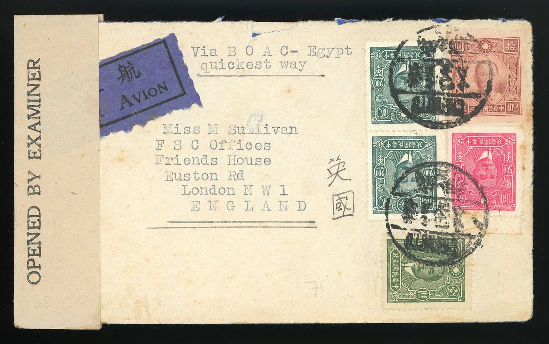 1943 airmail cover from Chengtu to London routed via India with Calcutta 'Opened by Examiner'.