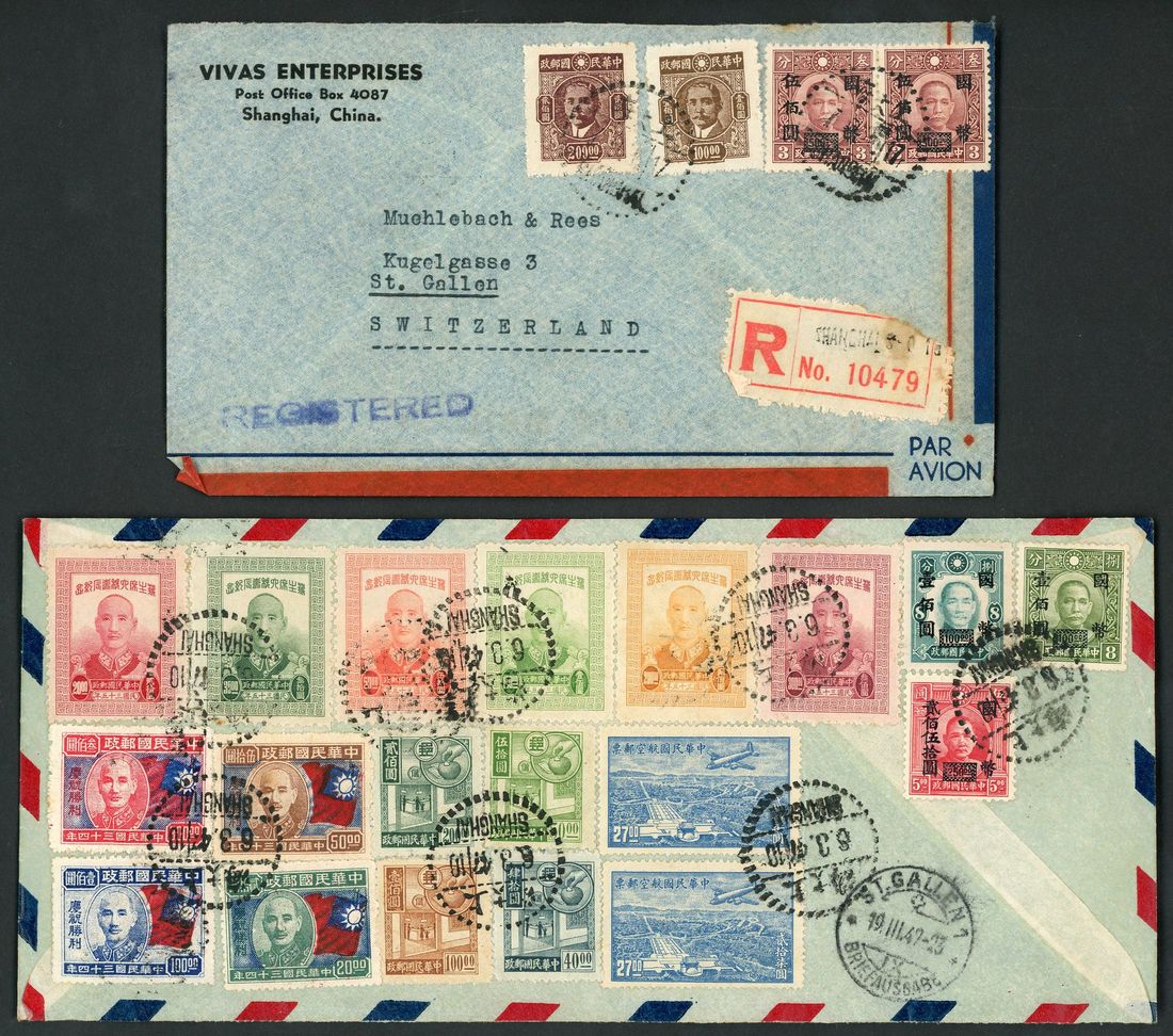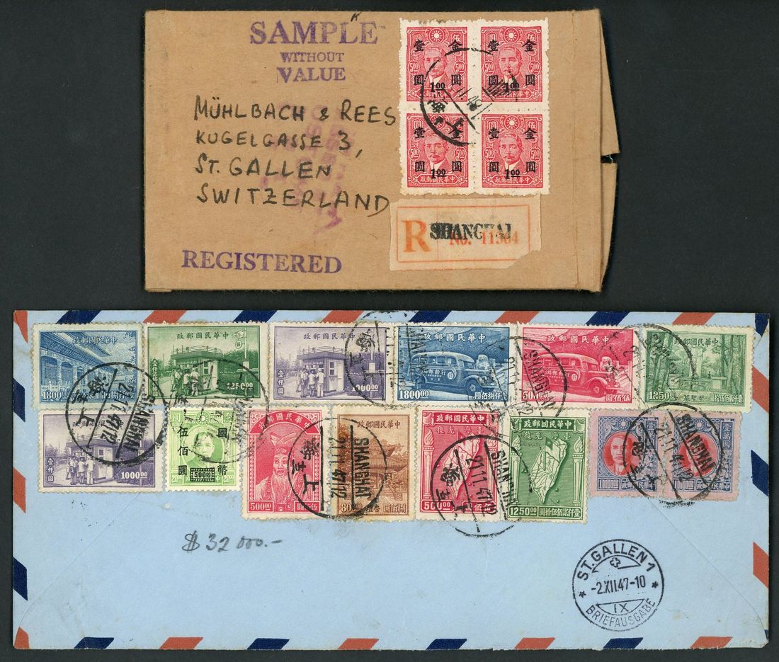 1946-1948 four registered air covers to Switzerland, including a cover bearing overprinted Gold yuan $1. on $5. block of four, tied by Shanghai c.d.s. (Nov. 1948).