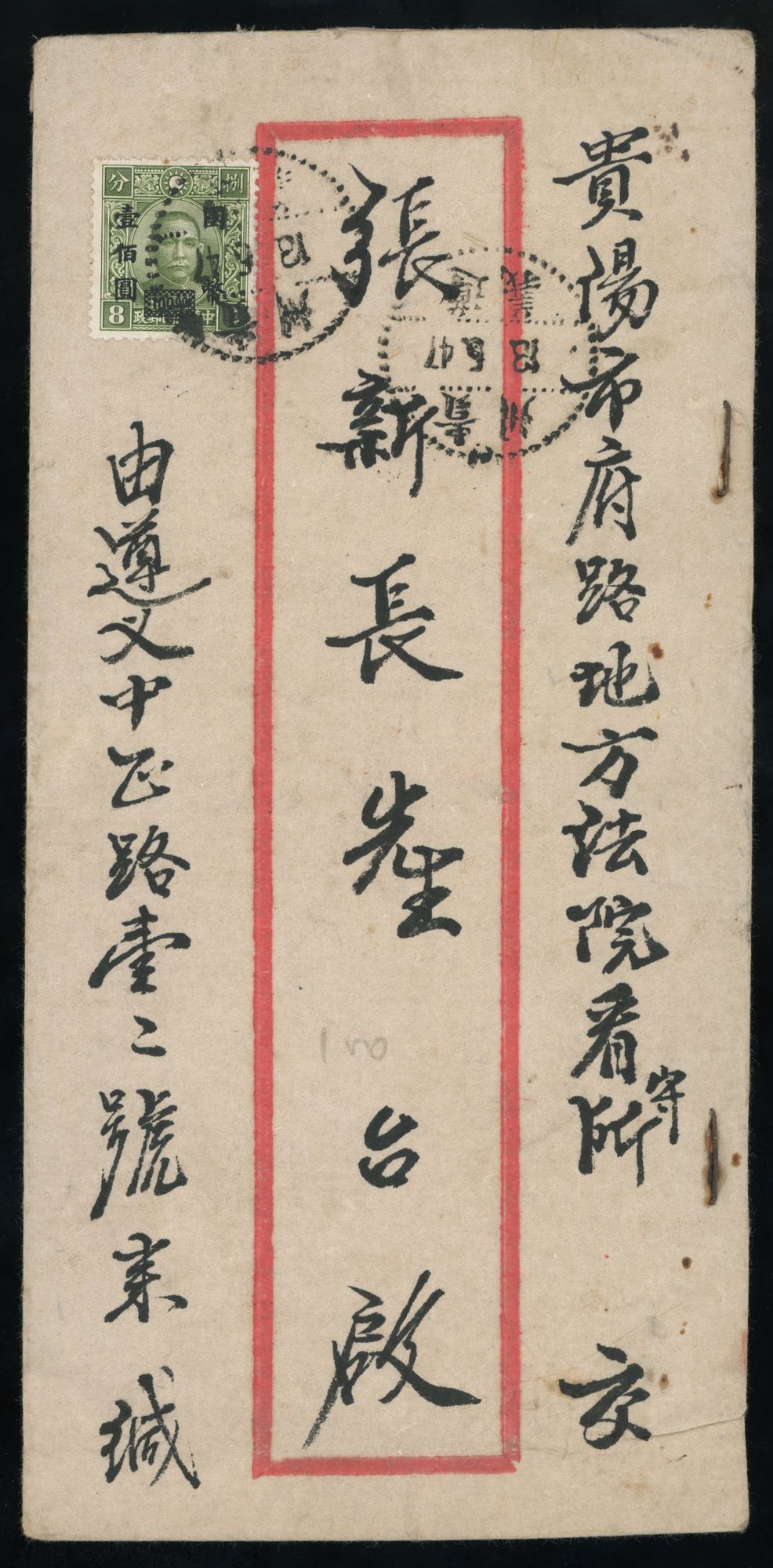 1947 (13 May) envelope to Kweiyang bearing CNC $100 on 8c. tied by Tsunyi dotted c.d.s., on reverse with Kweiyang (15.5) arrival c.d.s., showing censor handstamp of house of detention in red, fine.