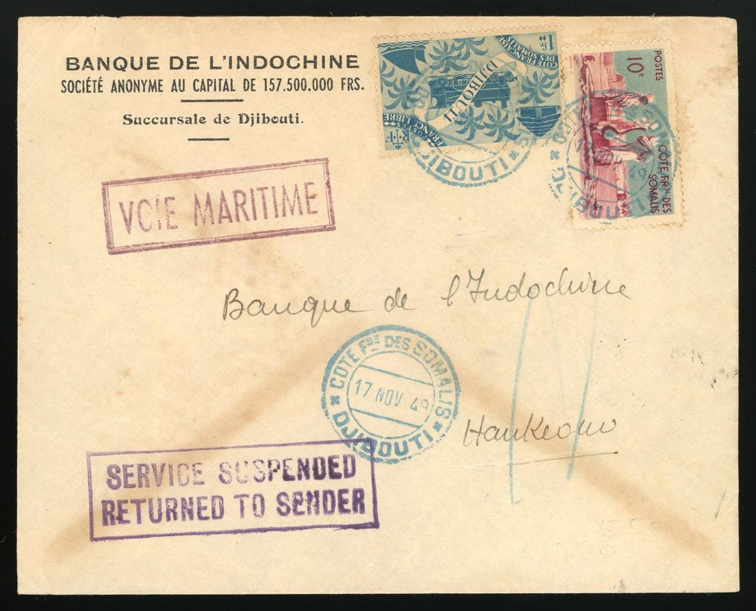 1949 (2 December) (Service Suspended Mail) cover from Djibouti to 'The Bank of Indo-China, Hankow' bearing Cote des Somalis 1f & 10f tied by 'Dibouti/Cote des Somalis' cds with boxed instructional 'Service Suspended/Returned To Sender' in violet on face. Fine item of suspended mail due to the continuing unrest in China.