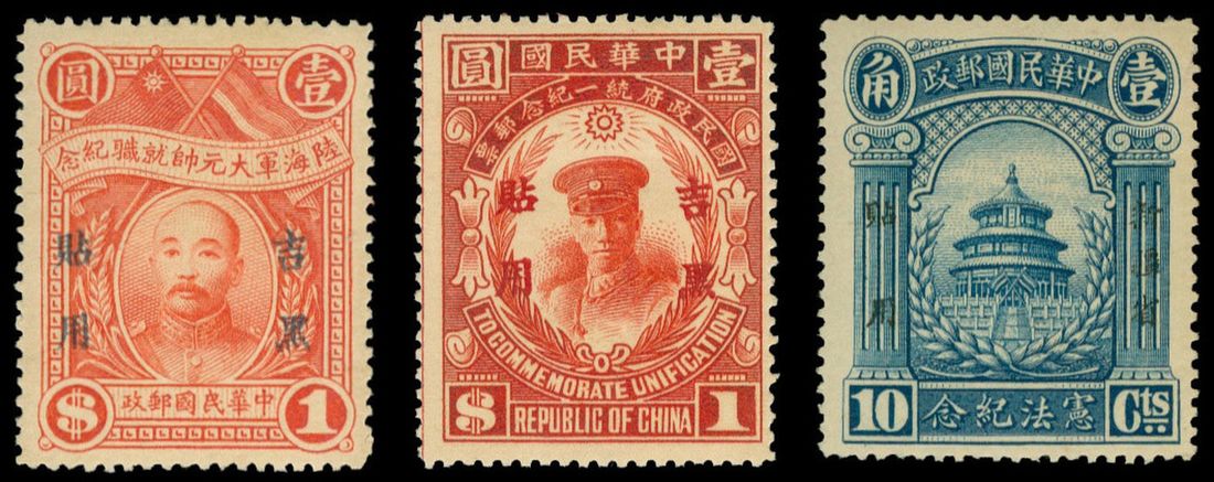 1923-29 commemorative sets with Adoption of Constitution, Chang Tso Lin (4c. and 10c. thins) and Unification, lightly mounted to large part original gum; fresh. (12)