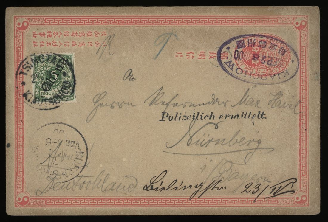 1900 (Sepetmeber) mixed franking card bearing German Post Office "China" ovpt on 5pf to Germany, with scarce oval Kiaochow postmark.