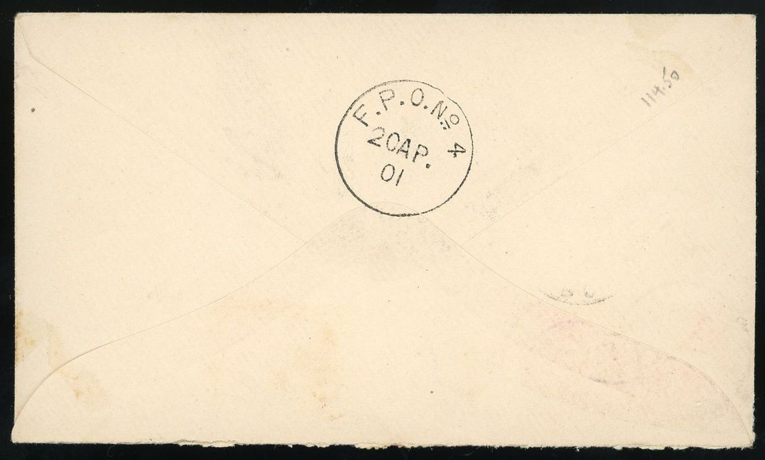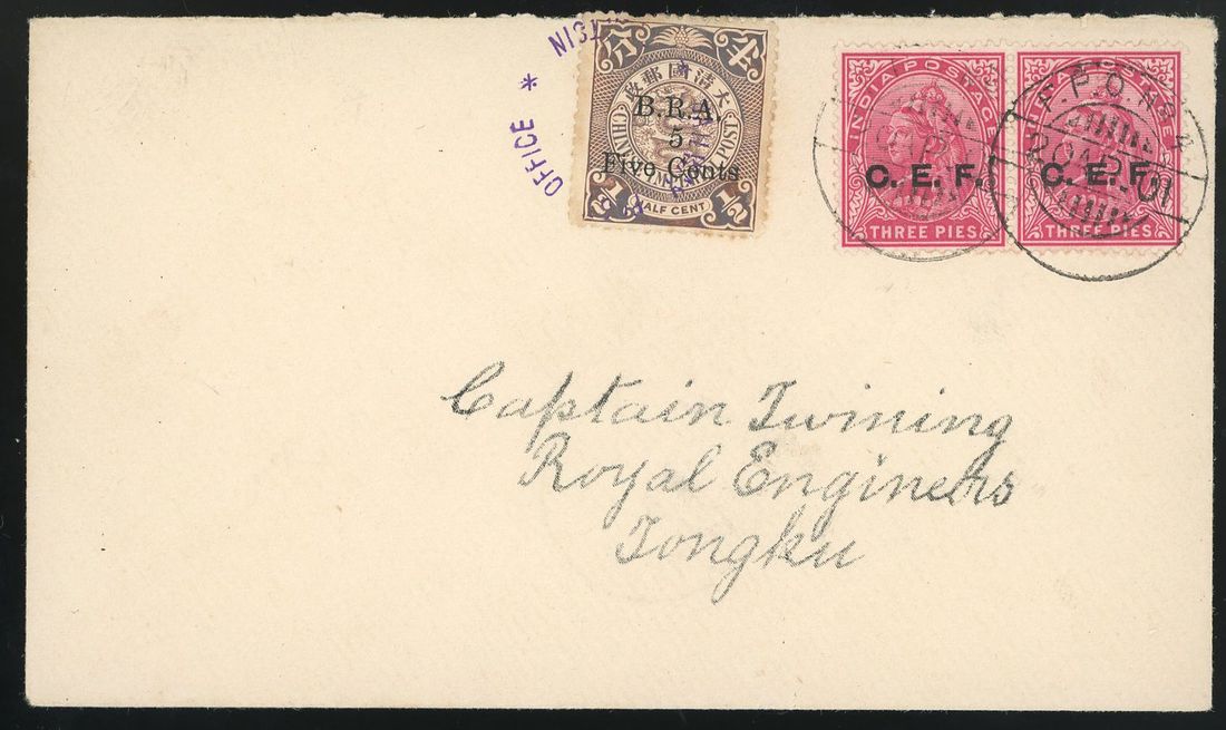 1901 (20 Apr.) a military cover to Tongku, bearing C.E.F. India Postage three pies x2, tied by F.P.O. No. 4 c.d.s., a C.I.P.½ cent. overprinted by B.R.A. 5c. tied by Tientsin Railway Post Office no circle c.d.s. alongside. On the reverse with F.P.O.No.4/ 2 CAP./01 postmark.
