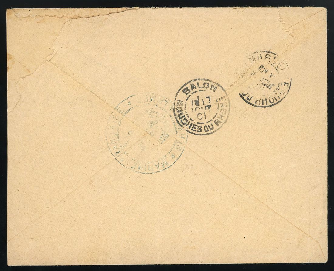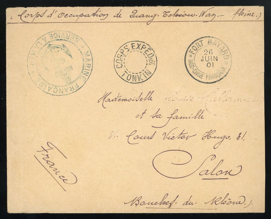 1901 stampless cover addressed to France endorsed 'Corps d'Occupation de Quang Tcheou-Wan' cancelled 'Fort-Bayard/Indo Chinese Francaise' date stamp (26 June 1901) with undated 'Corps Exped/Tonkin' and military cachet 'Marine Francaise/Service a la Mer; in blue on face with Salon arrival on reverse (17 August 1901).