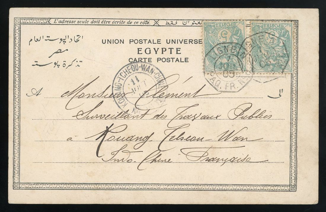 1905 (7 July) Picture postcard of 'Rue Kelmar, Suez' addressed to Kouang-Tcheou-Wan bearing French Type Blanc 5c x 2 tied by octagonal French paquebot 'Ligne N Paq. Ffr. No.6' cds (Salles 1924) with adjacent 'Kouang-Tcheou-Wan-Chine' receiver (11 August).