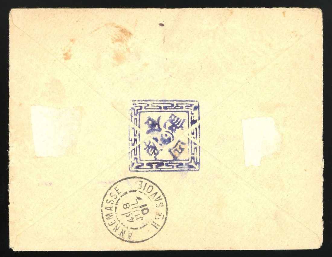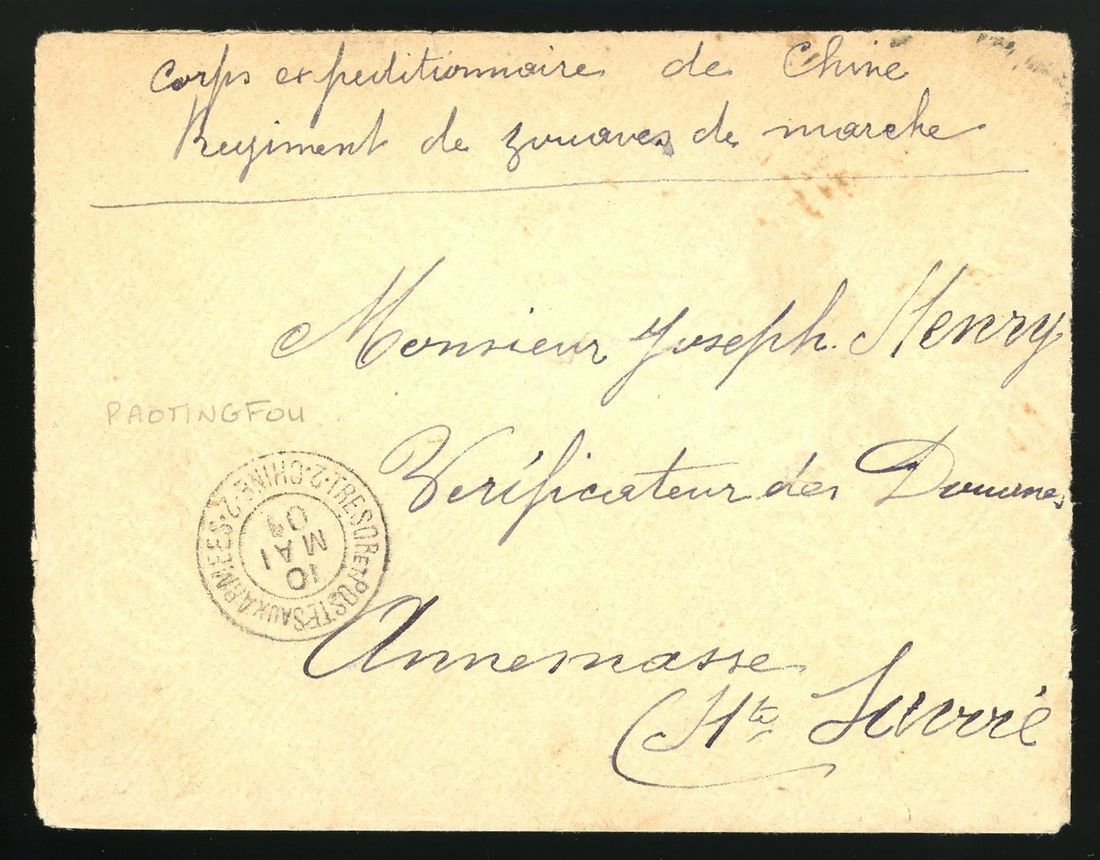 1901 (10 May) Boxer Rebellion cover endorsed 'Corps Expeditionnaire de Chine/Regiment de Zouaves de Marche' addressed to France cancelled by 'Tresor et Postes Aux Armee 2 Chine 2' cds with Annemasse arrival on reverse (8 July). Nice item from the Military Post Office in Pau-Ting-Fou.
