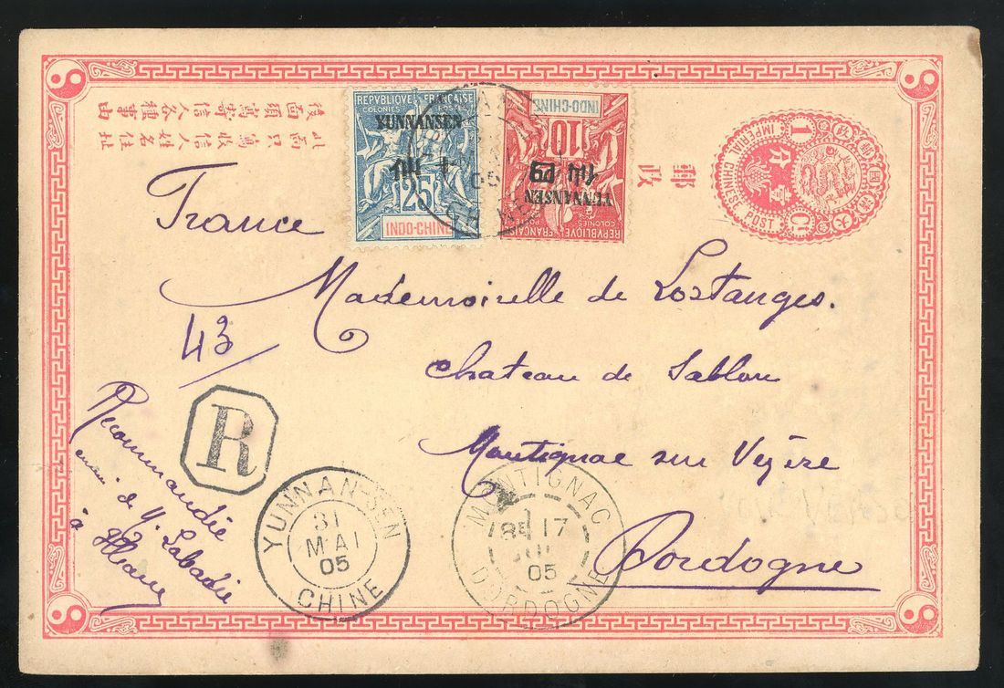 1905 (31 May) registered Imperial Chinese stationery card 1c bearing Yunnan 10c & 25c tied 'Yunnan-Sen/Chine' cds with framed hand-struck 'R', routed 'via Burm' with Dordogne receiver. Scarce item of registered mail.