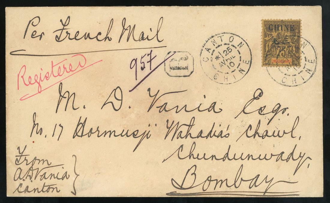 1910 (25 April) registered cover addressed to Bombay bearing French China 75c tied by 'Canton-Chine' cds with boxed hand-struck 'R' endorsed 'Per French Mail' with Bombay arrival.