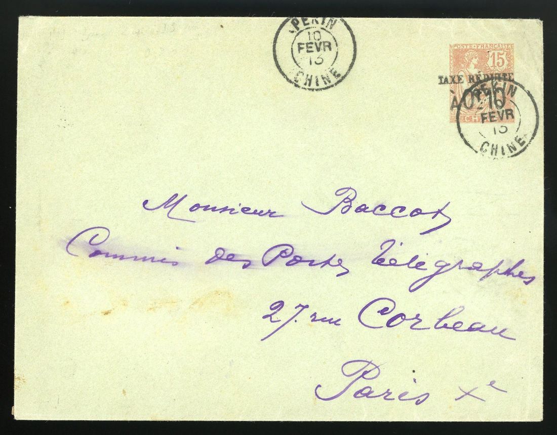 1913 (10 February) postal stationery 15c overprinted 'Taxe Reduite a 0f 10c' addressed to Paris cancelled by French Post Office Pekin/Chine c ds with Paris arrival on reverse.